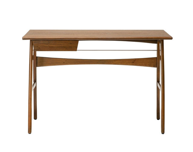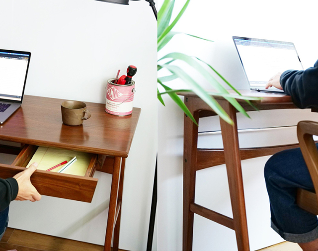 アメリカンヴィンテージの雰囲気を十分に持ち 現代の用途に合わせてデザインされた【DELMAR DESK/デルマーデスク】 ペーパーレスな時代に合わせ収納は必要最低限に留め、 奥行きも書きもの、ちょっとした作業机と言う用途におすすめのサイズ感です。 シェアオフィスや、ご家庭の寝室、1坪書斎などリビングスペース等でご使用頂くのにおすすめです。 なるべく圧迫感の出ないデザインを心がけ、奥行きが浅い分、 他の家具と並列で並べた時にさほど出っ張らないのがポイント。 また、抽斗は左右どちらでもお好みの方向に設置可能。あるいは無くして使用頂く事も出来ます。 デザインポイントは背面。アーチ状の幕板と貫、 その間に意匠で入っているアルミのバーとのデザインがシンプルな中にデザインとして生きています。 |