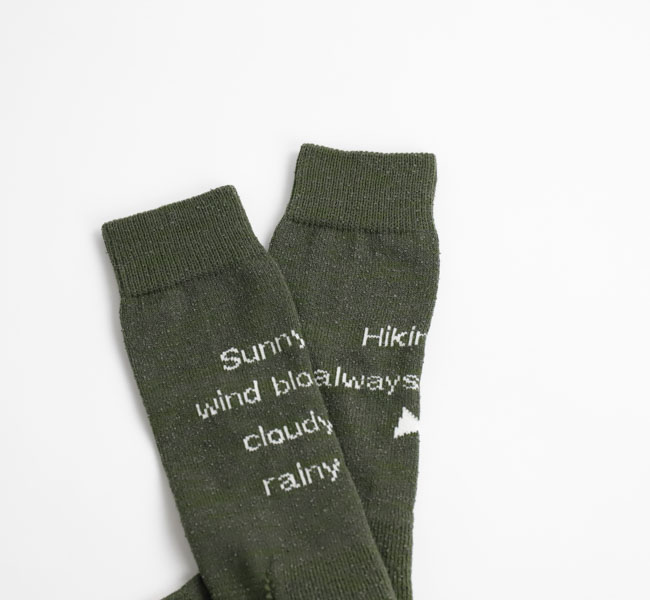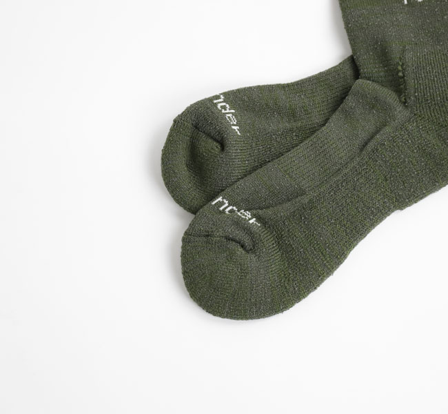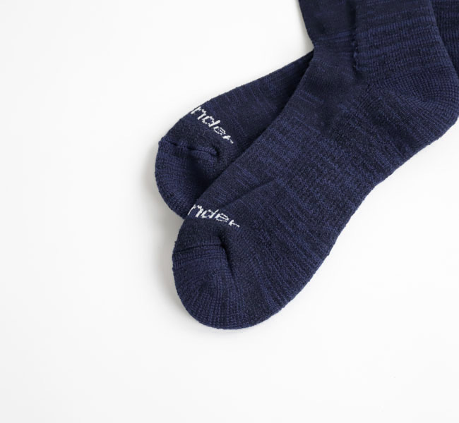 オーストラリアと米国の綿を使用した、ロービングヤーンに細い綿糸を巻くことで強力をもたせながらも多くの空気を含んだやわらかい糸と、ドライタッチで清涼感のある再生ポリエステルのループヤーンを引き揃えて編み上げた、肌触りと風合いにこだわったパイルソックスです。