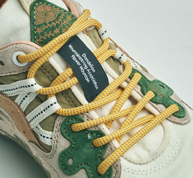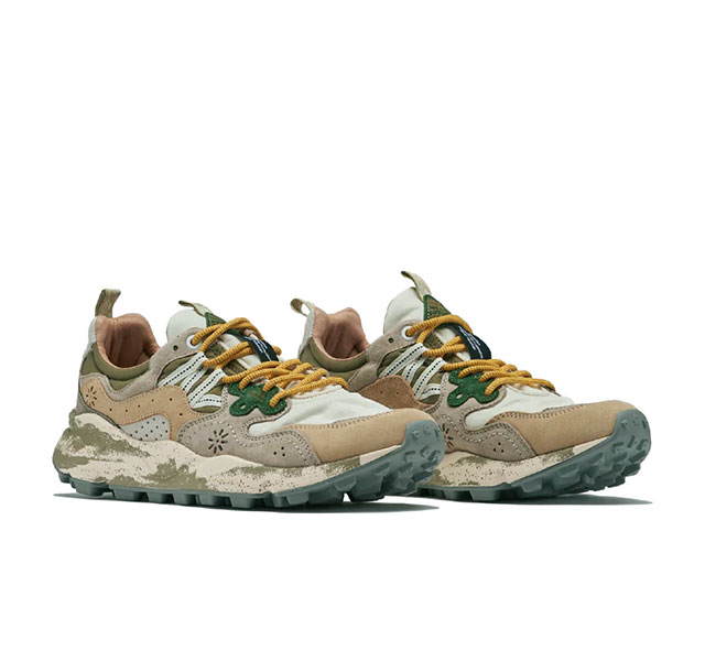 アイボリーからサンドベージュにかけてグラデーションするレイヤーにカーキをミックスしたアッパーにマスタードカラーのシューレースがアクセントになっている。