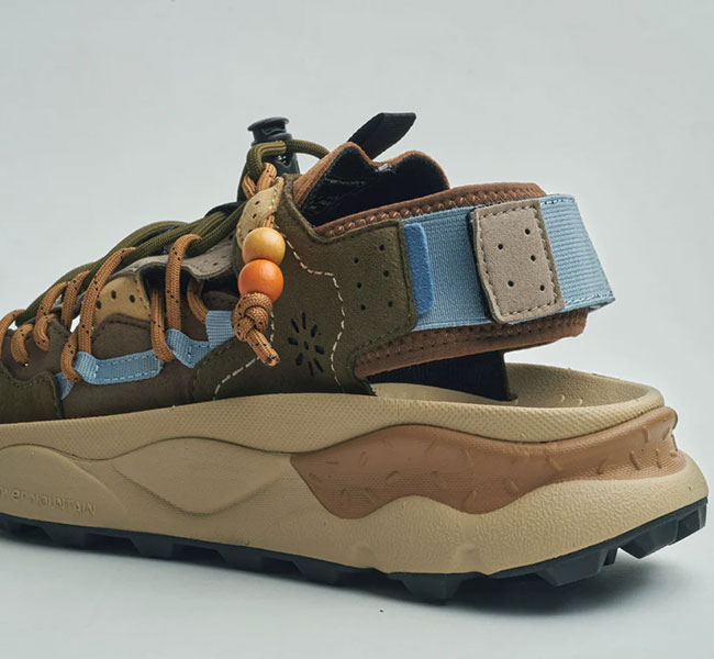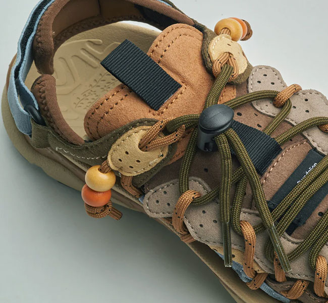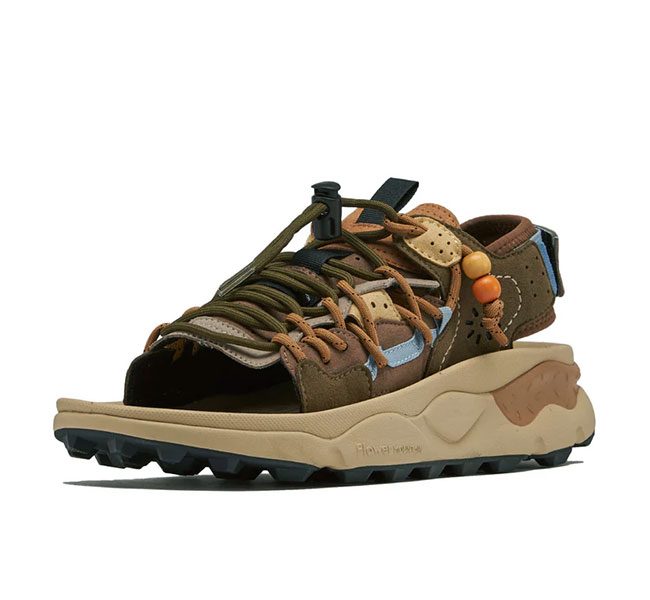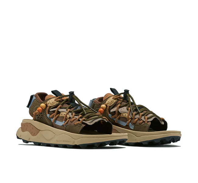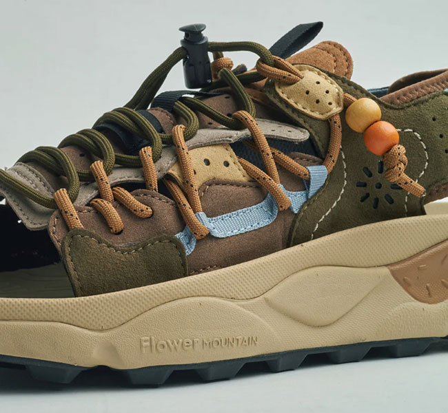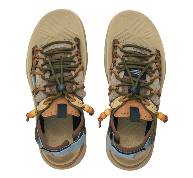 フラワーマウンテンらしい有機的な曲線美とパーツ構成、複雑に重なり合うディティール。そして、ヴィンテージ感漂うビーズをあしらったレースエンド…唯一無二の風格を纏うサンダル "PUMA PUNKU"