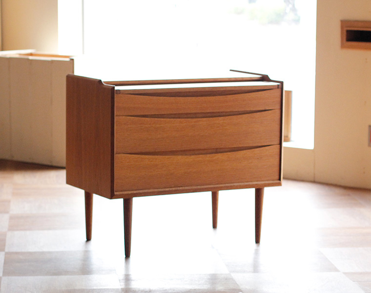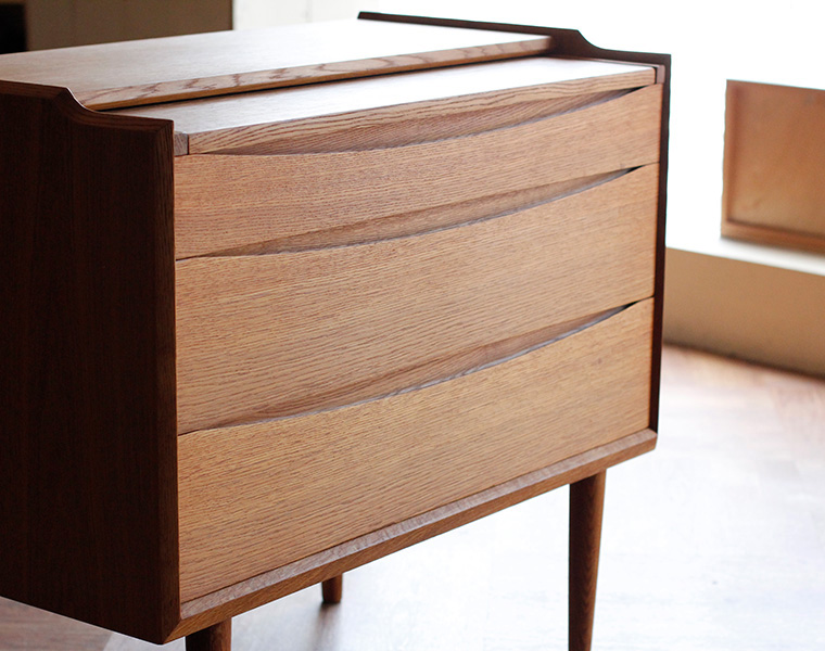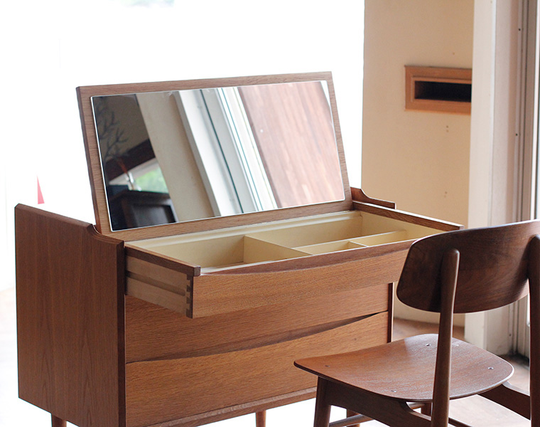 また、その天板を引き上げるとミラーが付き、細かく仕切りあり収納。