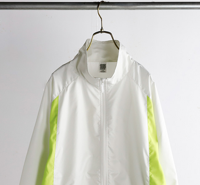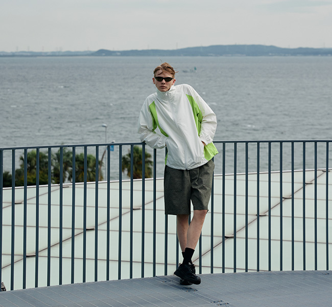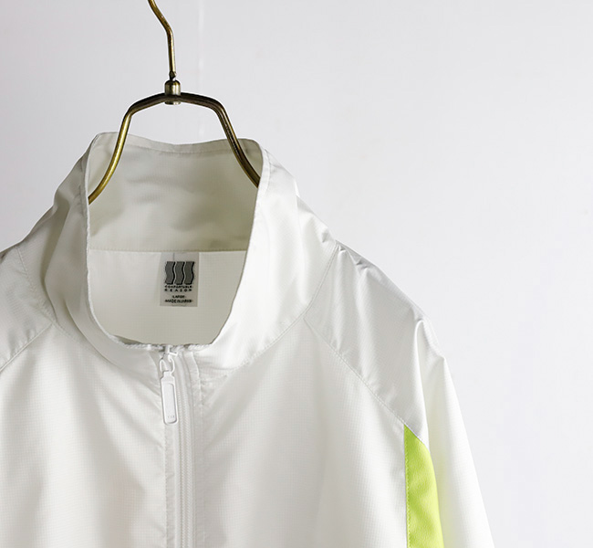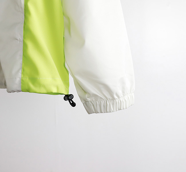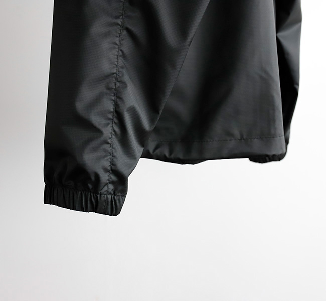 フロントにはシームポケットを配置し、可動域を考慮した袖のパターンと 軽量な素材の組み合わせによるシンプルでスポーティなデザインが特徴。裾はドローコード付き。