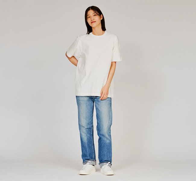 コットン 100%の糸を双糸にして編み立てた、厚みと柔らかさを兼ね備えた7.0オンス。着心地はソフトな風合いで、衿は昔ながらの雰囲気を出している為、テンションが弱く、洗いこむと衿が少したるむような雰囲気のTシャツです。