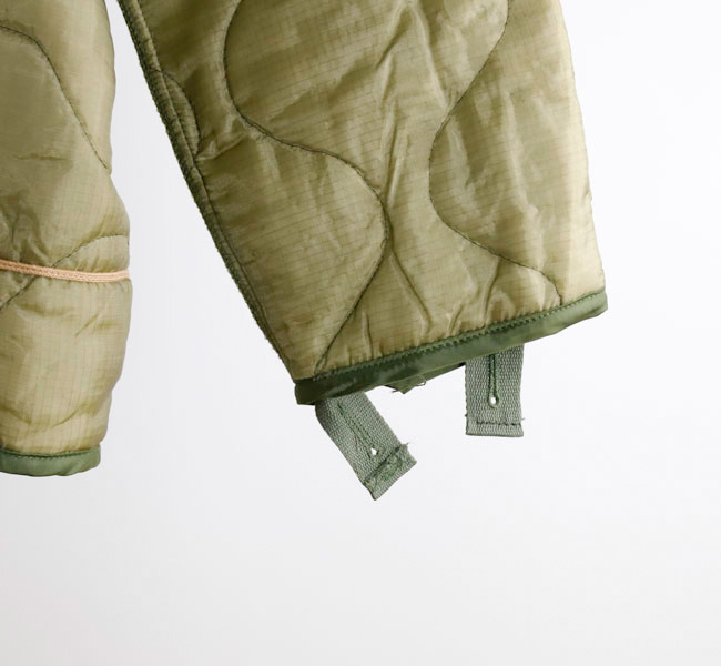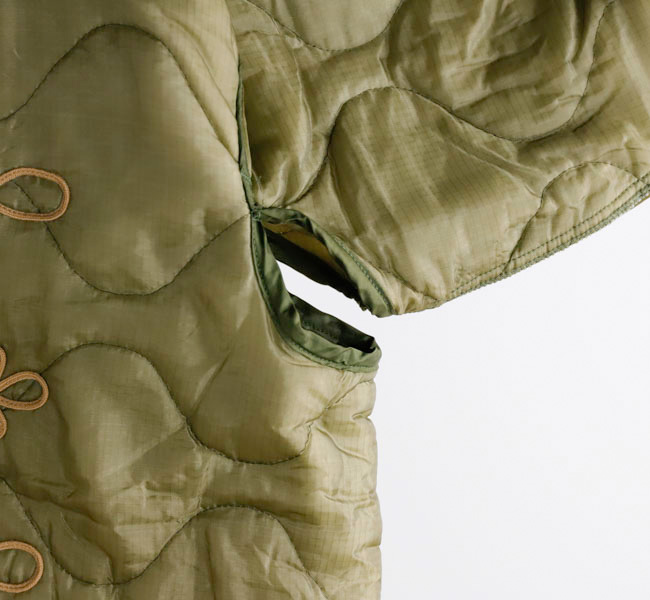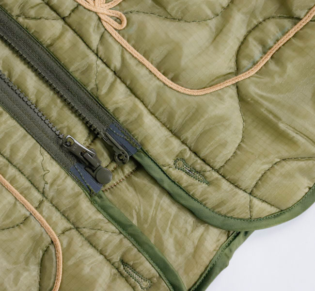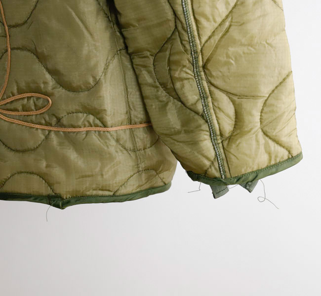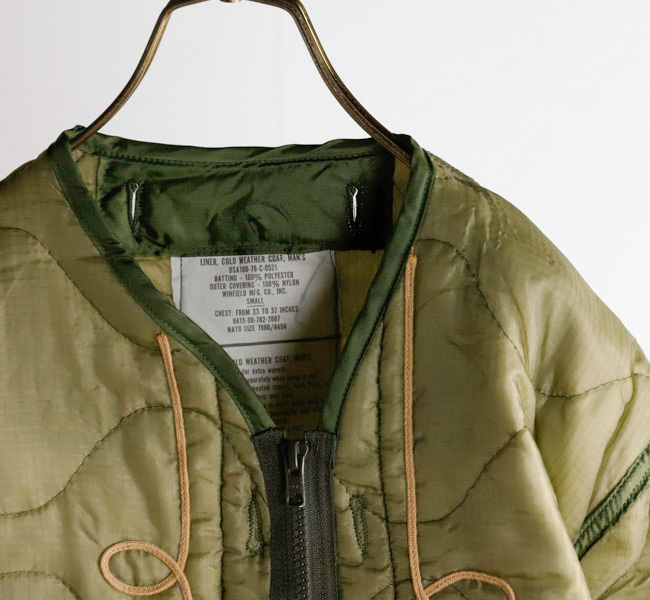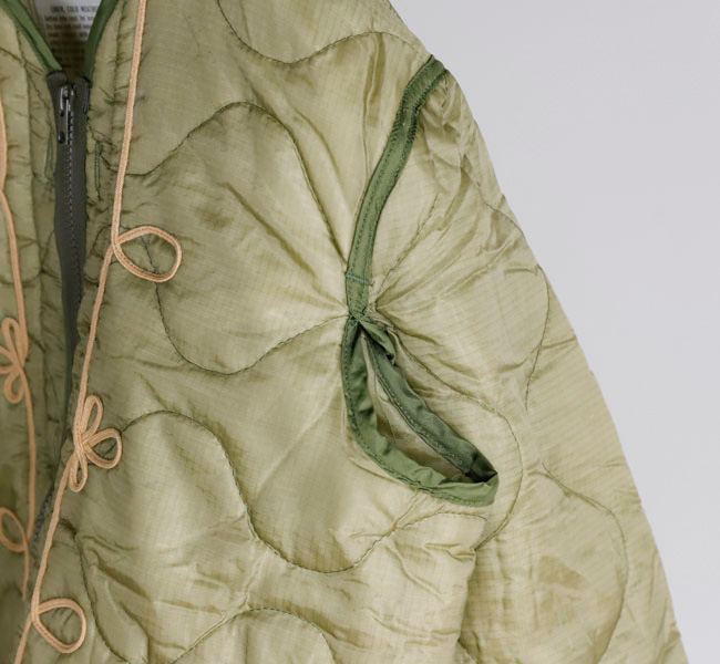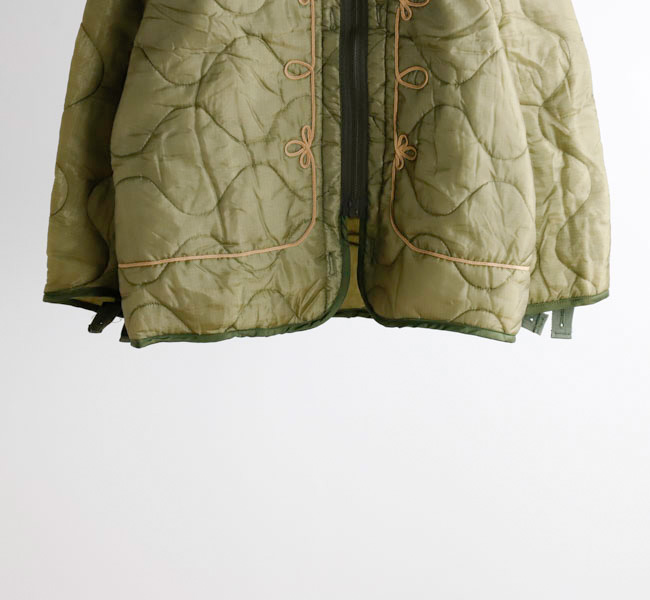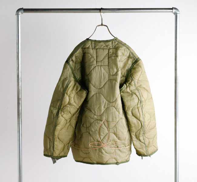 米軍より放出された70~80年代M-65フィールドジャケット用のキルティングライナーをリメイクした一着。 元からボタン無しの為、ファスナーでも使用できるようにし、ロープを施しアクセントに。 男女問わず着用でき、ライナーとしてもアウターとしても使用可能。