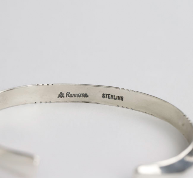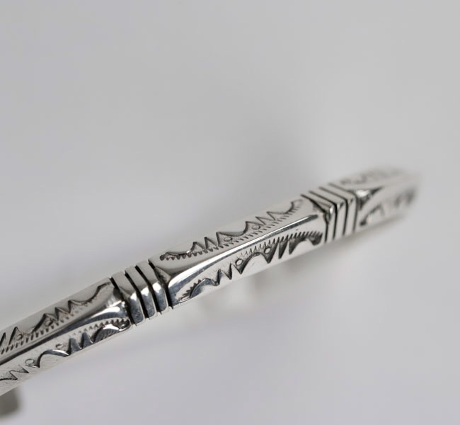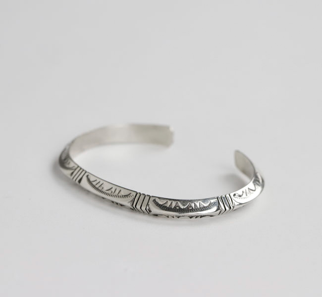 スタンプワークに定評のあるジェネバラモーンのバングルです。鏡面トライアングルワイヤーの両面に様々なスタンプを刻み、ファイリングで削って立体感をプラスした人気モデル。細身でも手首にしっくりくる適度な重さが心地よく、1本着けでも重ねづけでもあわせやすいバングル。年齢性別問わずおすすめです。