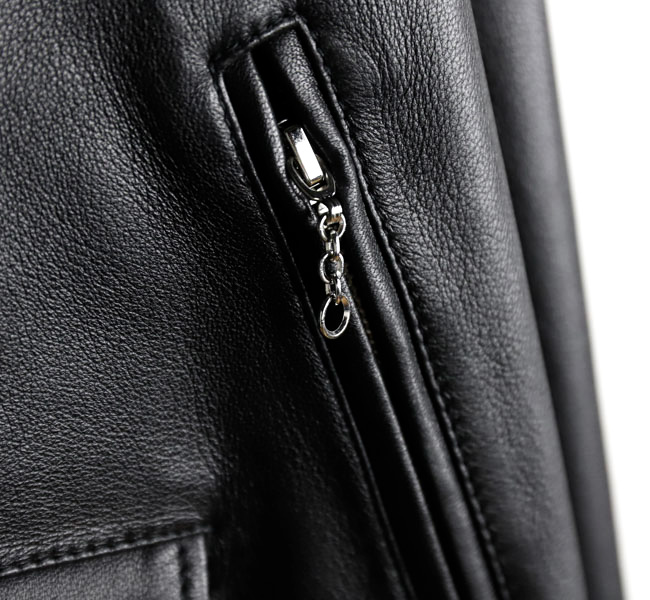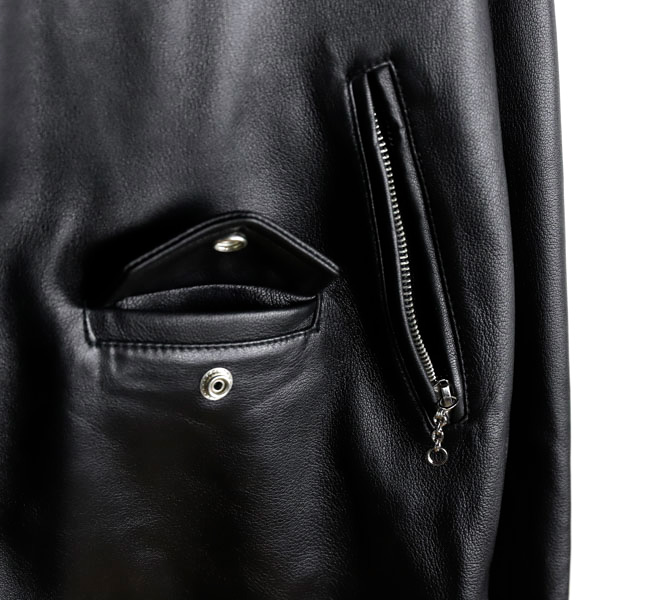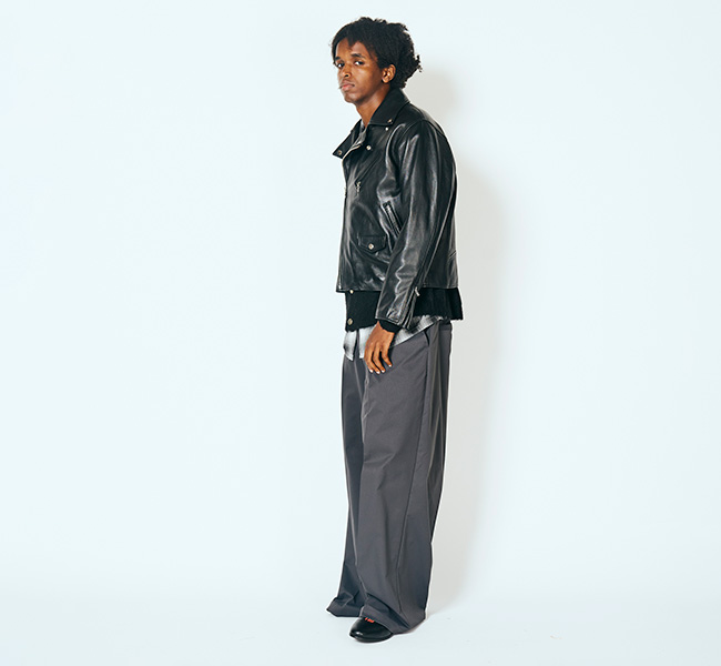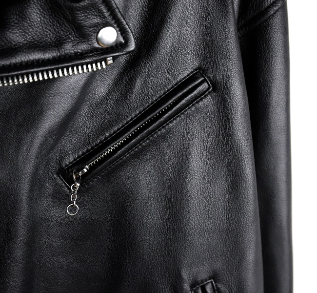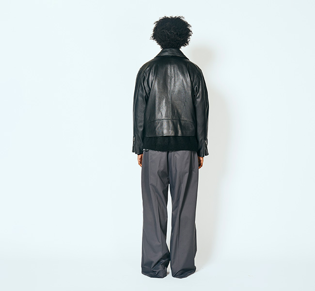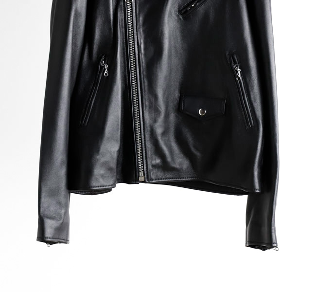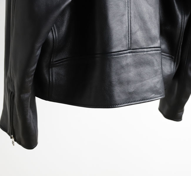 第一次世界大戦時、パイロットのために作られたコートのフロントファスナーを斜めに備えたジャケットがライダースの源流と言われています。身体に沿うように、着心地を重視したパターンは、着用時にきれいなシルエットになるように仕立てました。ハンドドローイングパターンを採用することでやわらかいラインのアナログでぬくもりのある曲線を継ぎ合わせています。ラムレザーはなめらかで、繊維質も均一でしなやかさと強度があるのが特徴でレザーならではの経年変化を楽しめます。