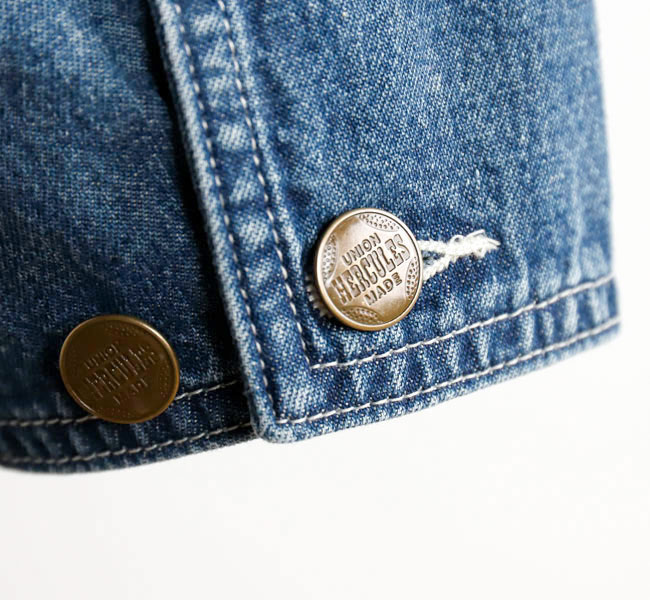 ポケットの角部分はあえてゆるめのカーブ状にステッチを入れて、大量生産していた時代のラフな雰囲気を忠実に表現。 ステッチ裏、カン止めには、グリーンの糸を使い、当時見えない箇所には工場の残糸を使用していたようなイメージに。