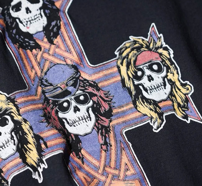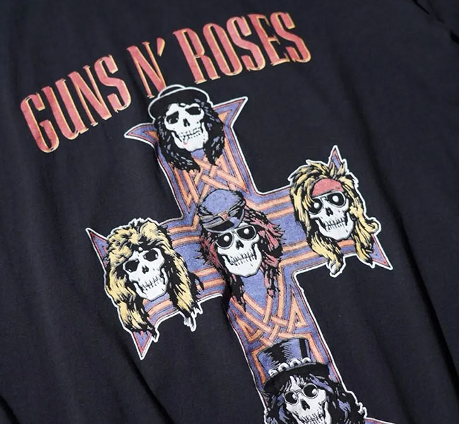 記念すべき87年作の1st LPにしてバンドの象徴的なデザインでもある「Appetite For Destruction」のジャケットアートワークのTシャツ。
