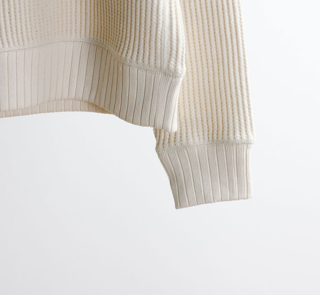 独特のムラ感が特徴的なラフィ綿糸をダブルジャカード編み機で編み立てた粒立が大きいビッグワッフル。ビッグワッフルは温かみのある表情でふっくらとした肉厚な素材感ながら耐久性も兼ね備えた素材です。永く愛用していただくためにロール状になったビッグワッフルを放反し一度、リラックスさせてから裁断、縫製。着用と洗濯を繰り返しても歪みや縮みが起こりにくくする工夫と手間を加えています。主要部分の縫製は縫い代がごろつかないフラットシーマですので着用時の肌面へのストレスが少なく直接肌に触れる部分も快適です。首元、袖口、裾は軽さがあり硬めの針抜きリブを使用していますので洗濯時の伸びや縮みもほぼありません。