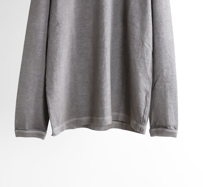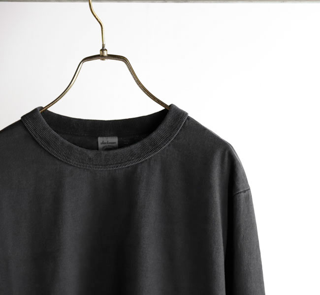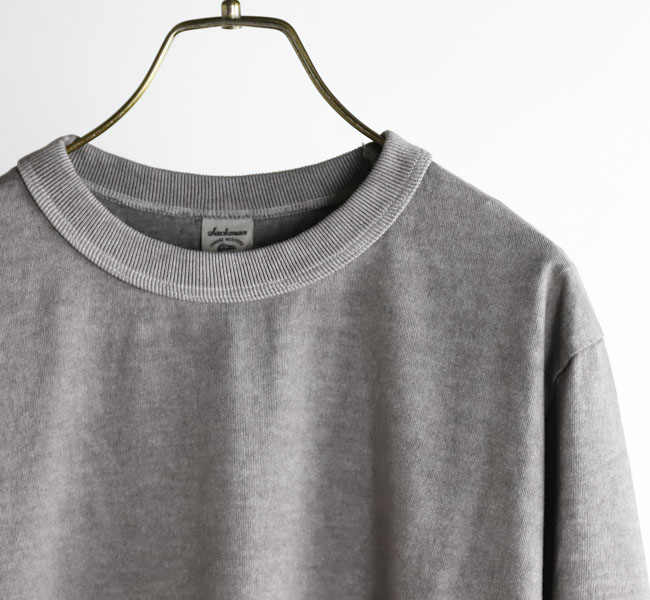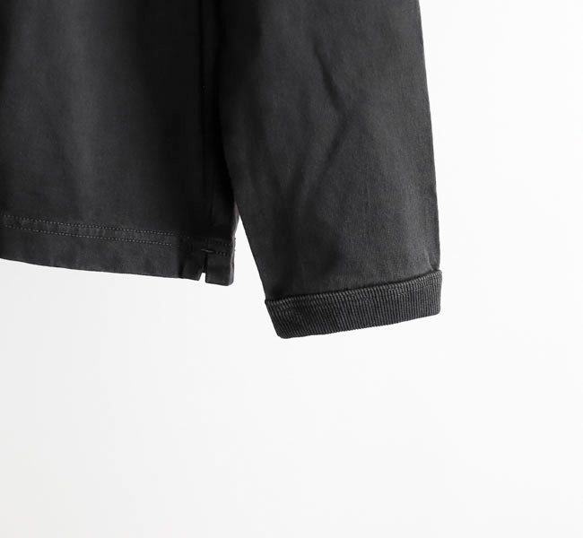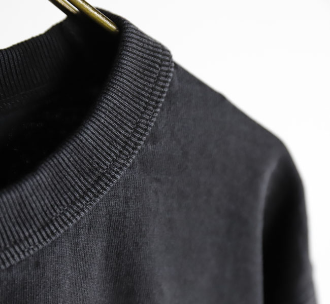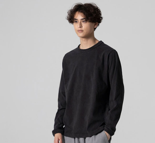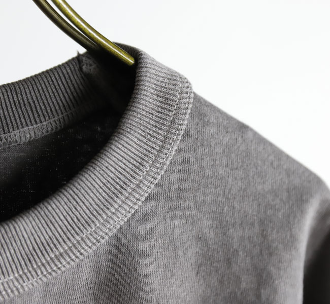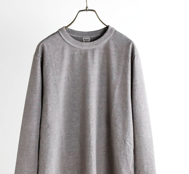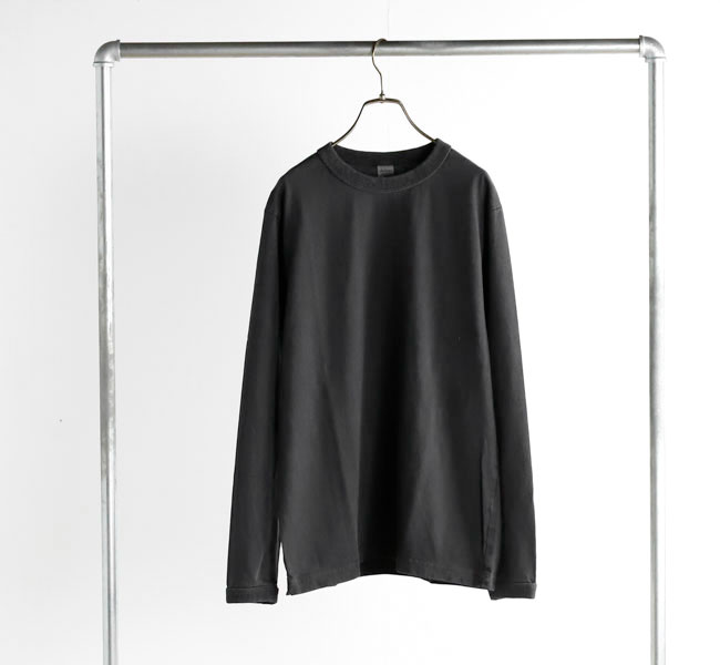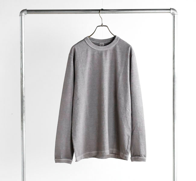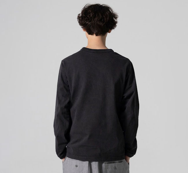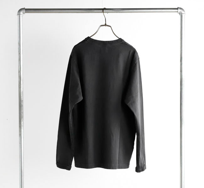乾燥感がありザラッとした肌触りが特徴のアメリカ綿を空気紡績によって粗野な表面感に仕上げた長袖Tシャツです。首元のリブを地厚なリブに変更。表面感に合った頑丈な仕様にアップデートしました。設計の修正と縫製技術で首元の収まりがきれいになるように工夫。1枚で着用しても見栄えのするロングスリーブTシャツに生まれ変わりました。従来のポケット付きは展開しません。