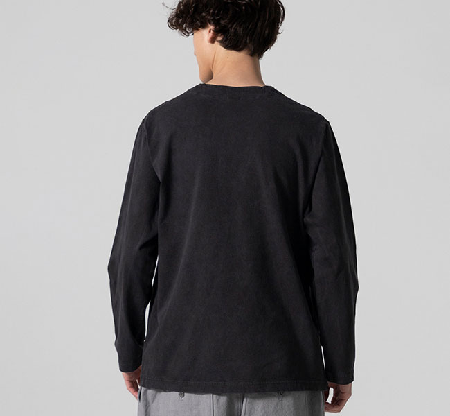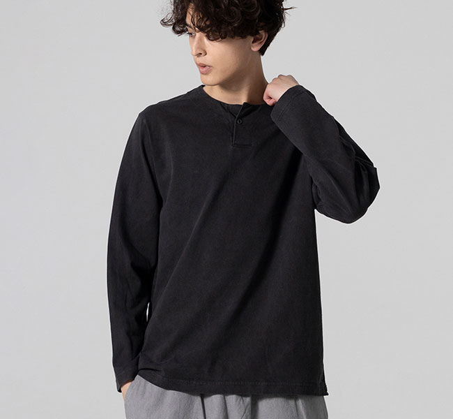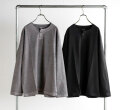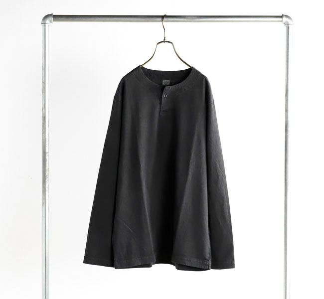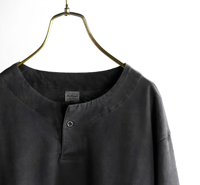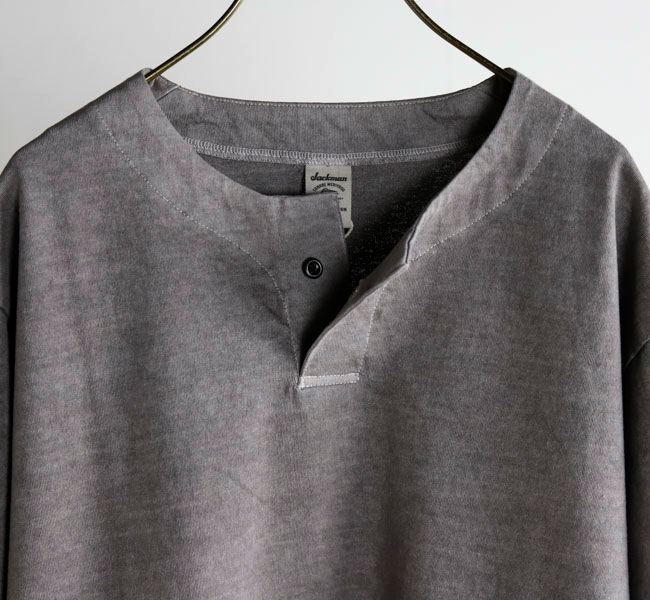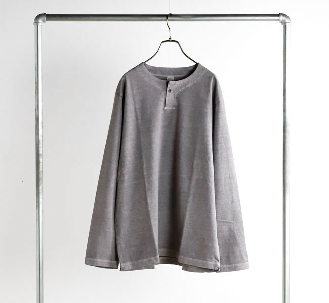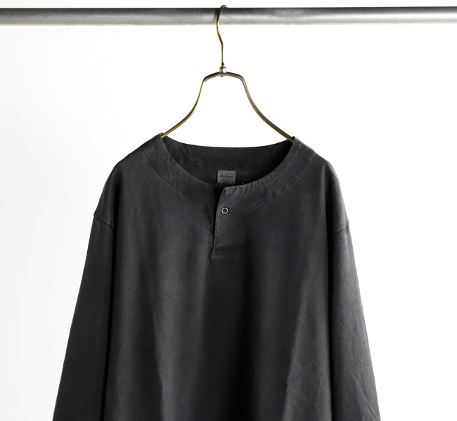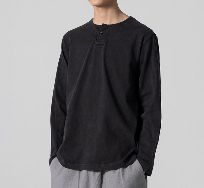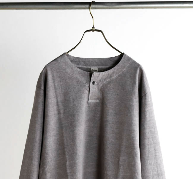 乾燥感がありザラッとした肌触りが特徴のアメリカ綿を空気紡績によって粗野な表面感に仕上げたヘンリーネック長袖Tシャツです。Baseballユニフォームのような首周りのデザインと肌着っぽくならない1つボタン仕様を加えた特徴的なデザインはBaseballのDNAを色濃く反映したデザインです。スペアボタン付き。