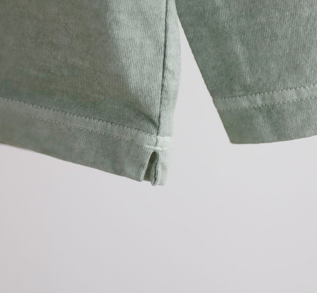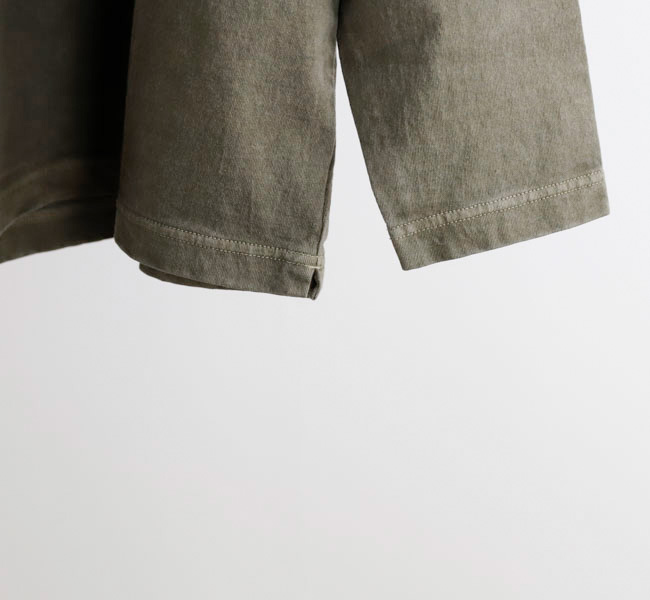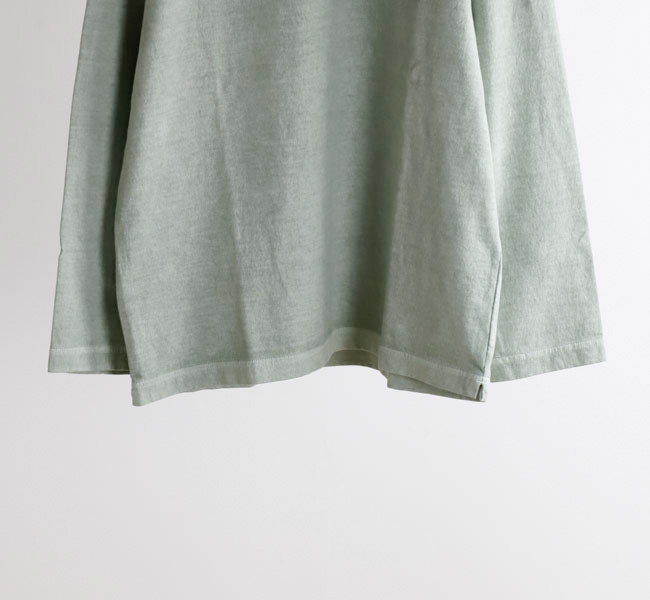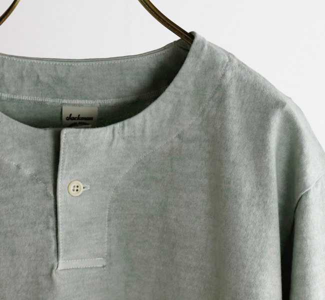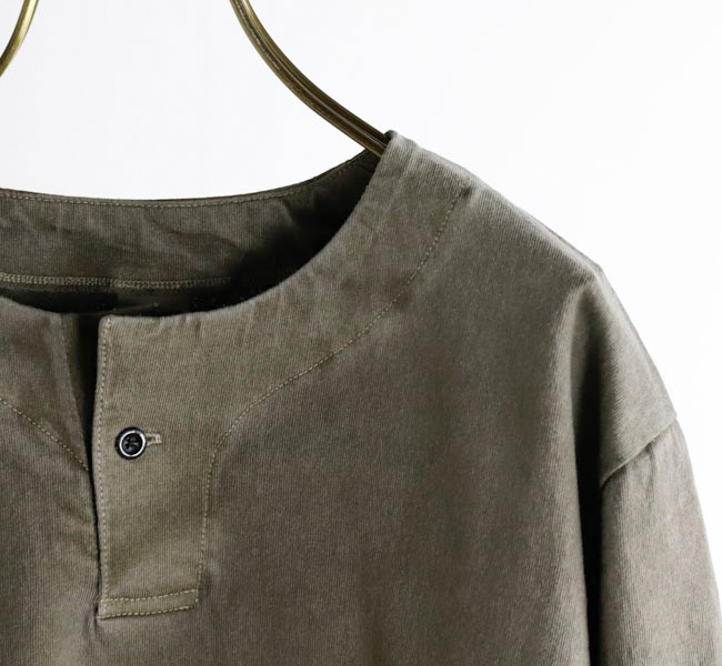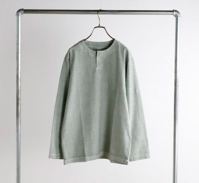 乾燥感がありザラッとした肌触りが特徴のアメリカ綿を空気紡績によって粗野な表面感に仕上げたヘンリーネック長袖Tシャツです。Baseballユニフォームのような首周りのデザインと肌着っぽくならない1つボタン仕様を加えた特徴的なデザインはBaseballのDNAを色濃く反映したデザインです。25春夏はピグメント染色カラー2色で展開します。スペアボタン付き。