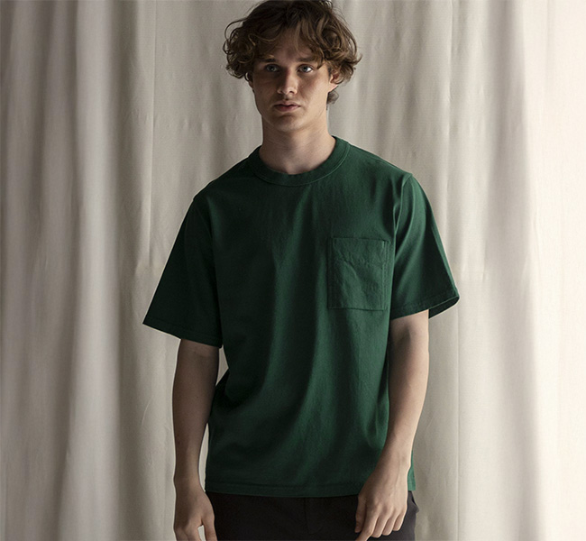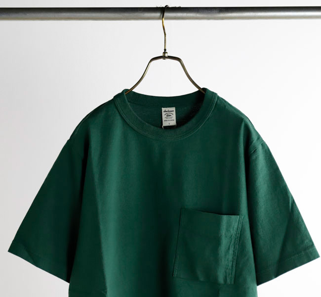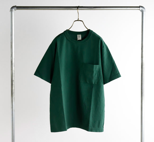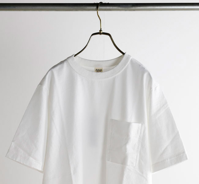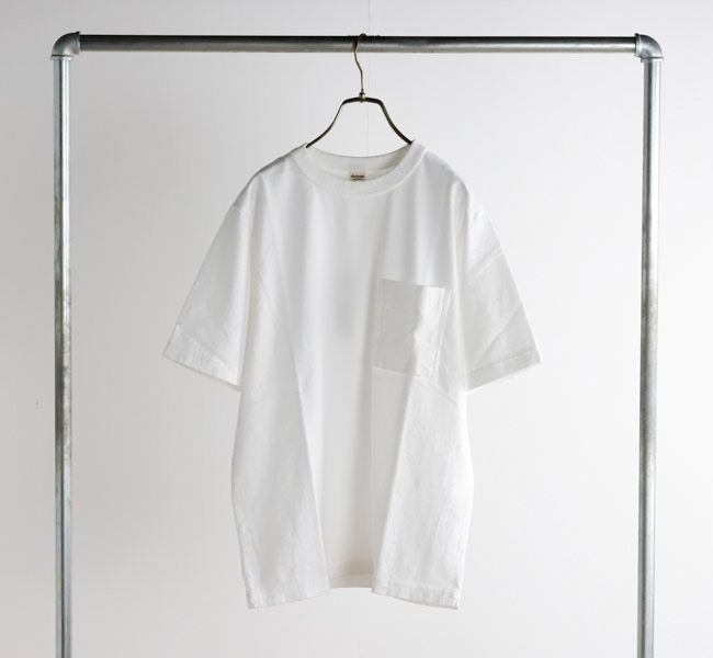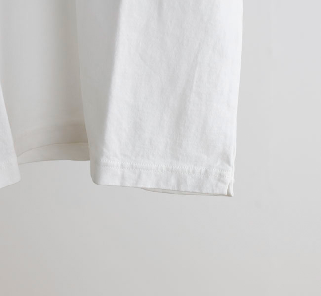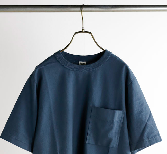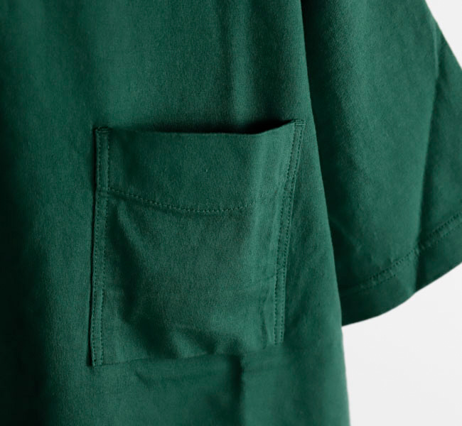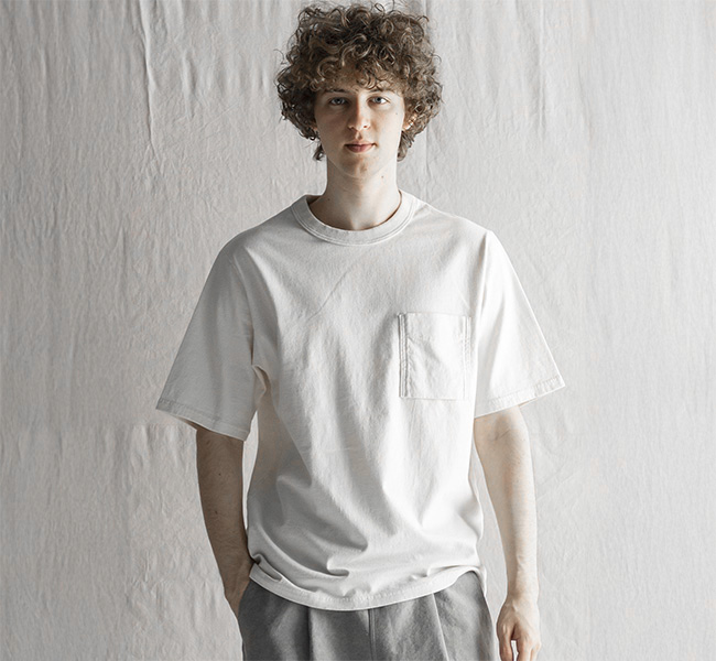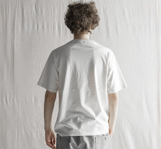 乾燥感がありザラッとした肌触りが特徴のアメリカ綿を空気紡績によって粗野な表面感に仕上げたポケットTシャツです。大振りのポケットや形状、Wステッチは1890年代のアメリカで着用されていたBaseballユニフォームの代表的なディティールを再現しました。25春夏シーズンより首元のリブを地厚なリブに変更。表面感に合った頑丈な仕様にアップデートしました。設計の修正と縫製技術で首元の収まりがきれいになるように工夫。1枚で着用しても見栄えのするポケットTシャツに生まれ変わりました。