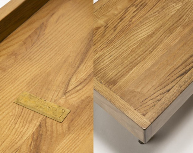| アッシュ、スチール、真鍮 ※木材の風合いを生かし表現するような加工を施しています。1つ1つ、木材の表情が異なり、割れや、釘穴、連結穴があります。時間をかけて変色したような色の濃淡や使っていくうちに自然に剥離していったような塗装。アンティーク家具特有の汚し加工。板の継ぎ目が浮き出て見えるようなライン。見方によっては長く使っていくことを心配される箇所もありますが、強度的には問題ありませんので、安心して長くお使い頂けます。 |