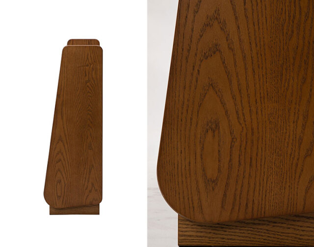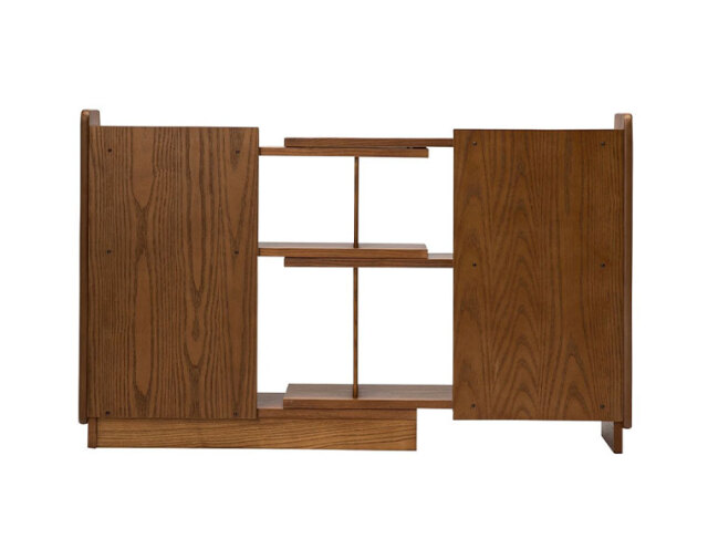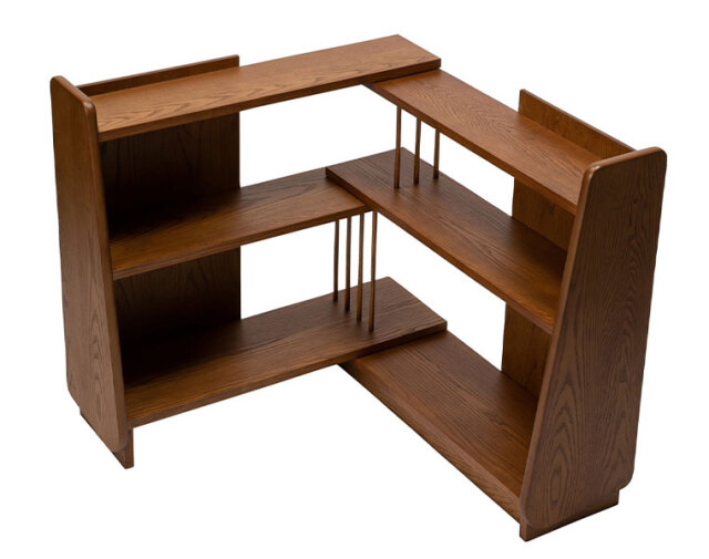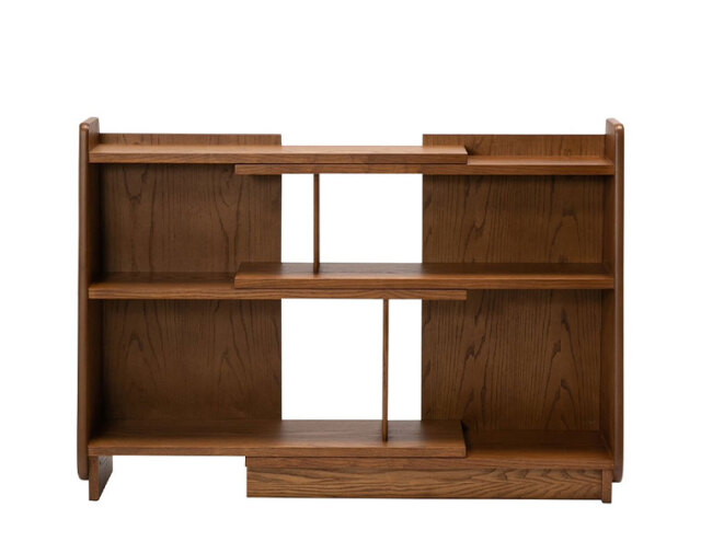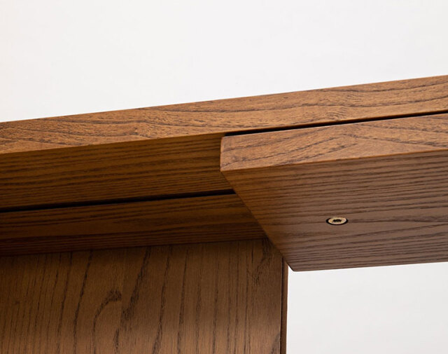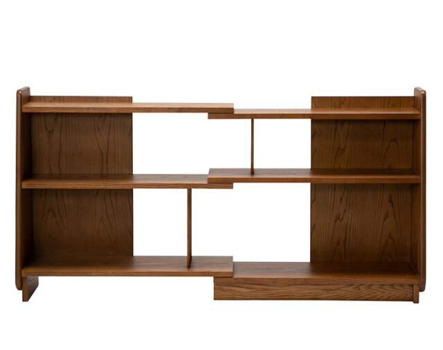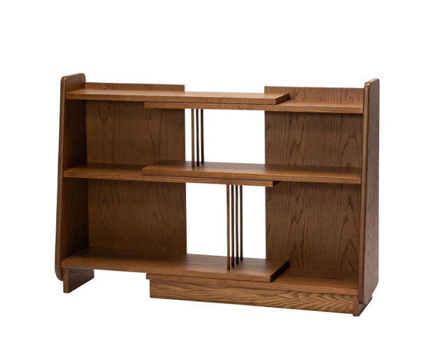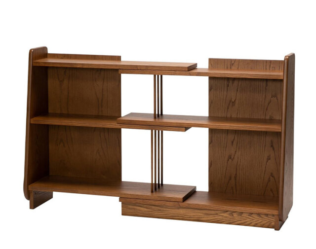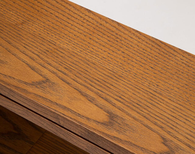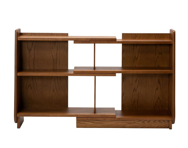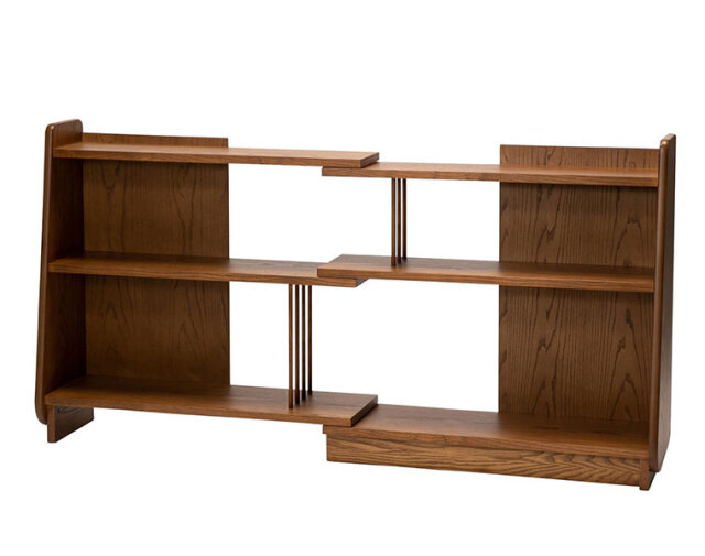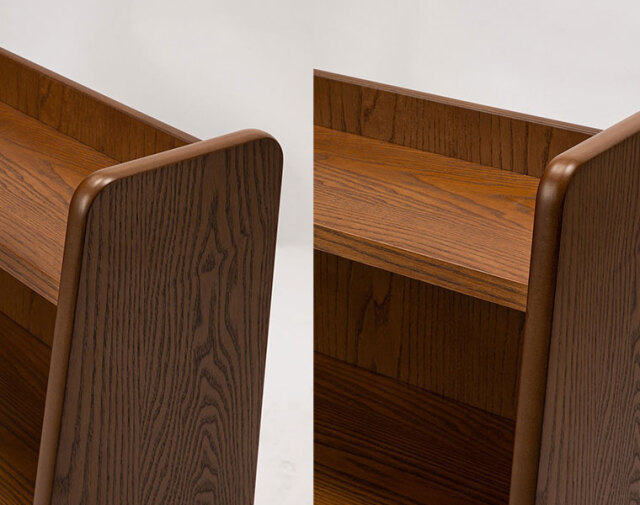 丸みを持たせたサイドパネルと、「仕切り」「上下加重を支える支柱」の2つの役割を担う丸棒の配列が柔らかい印象を与えます。