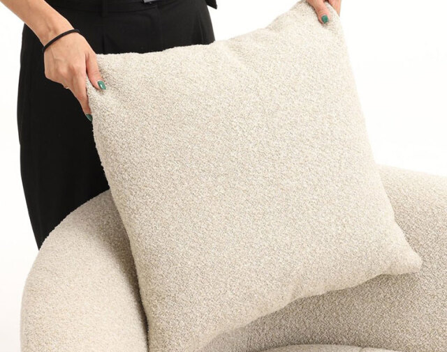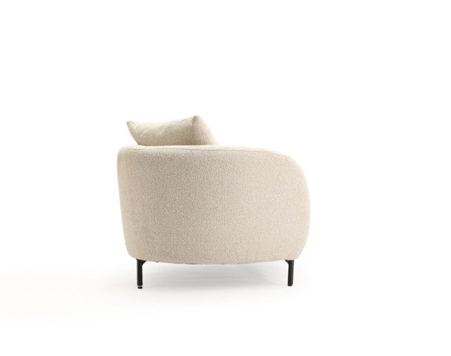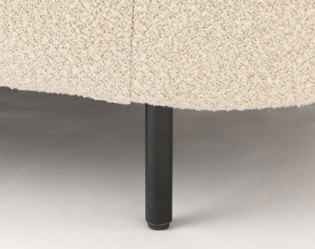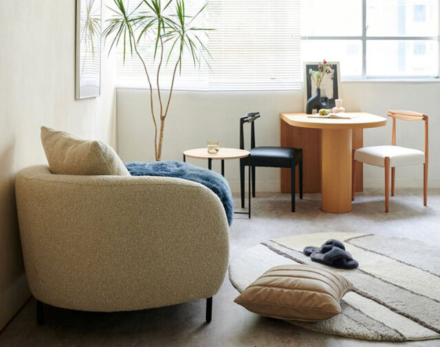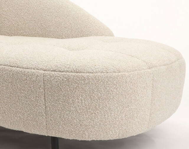 ベージュのブークレ素材の張地が、上品でありながらも軽やかな印象を与え、インテリア全体を落ち着いた雰囲気にまとめてくれます。