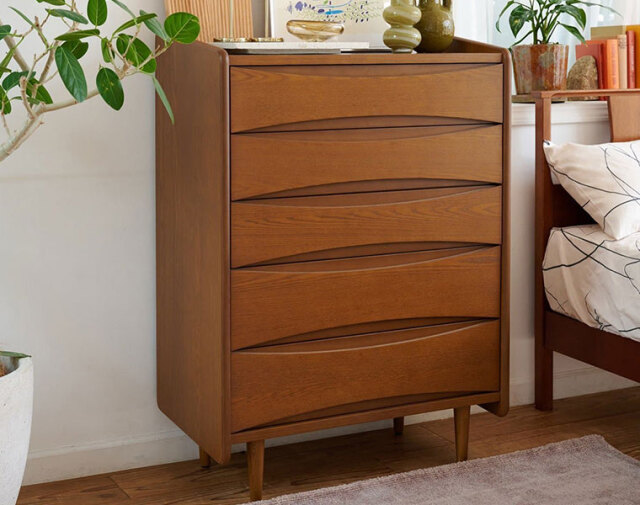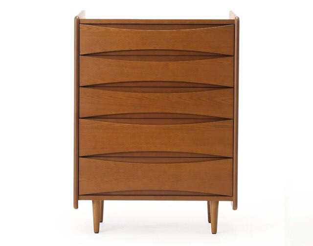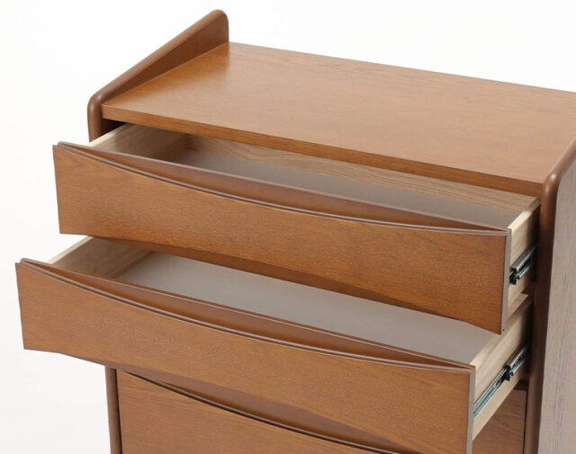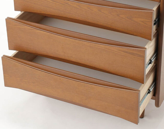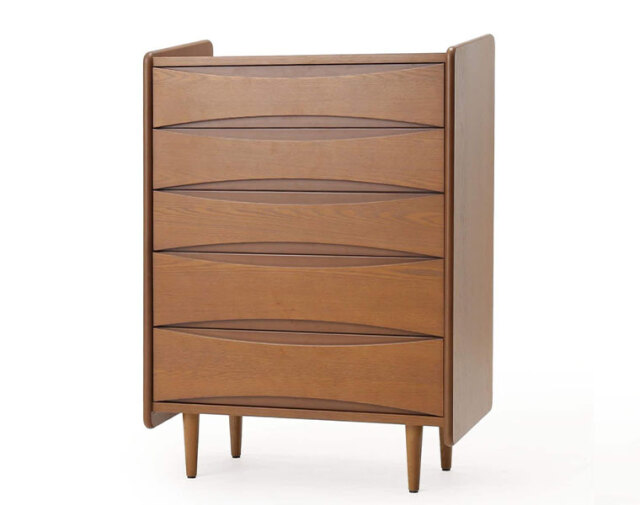 5杯の抽斗(ひきだし)を備えており、リーフ状の窪みが取っ手として機能するデザインが特徴です。