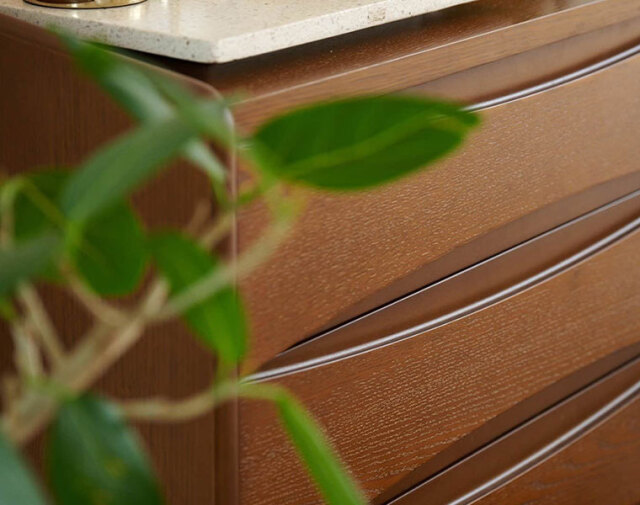 このリーフ状のデザインにより、抽斗の配列にリズムが生まれ、単調さを感じさせません。