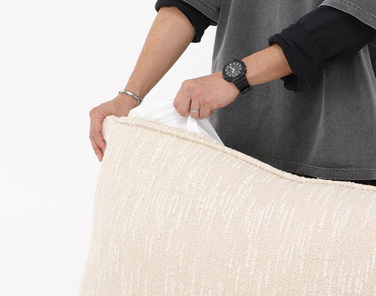広い座面を最大限に楽しむため、背もたれは自由に場所を変えられる 特大サイズのクッションです。 包まれるような柔らかさを実現しました。身体を預け、まるで大きなペットのような抱き心地を楽しめます。