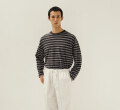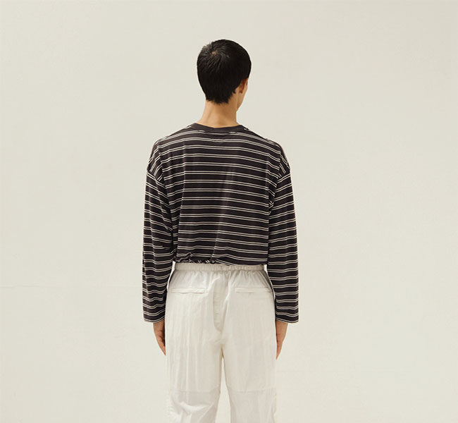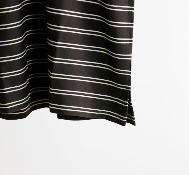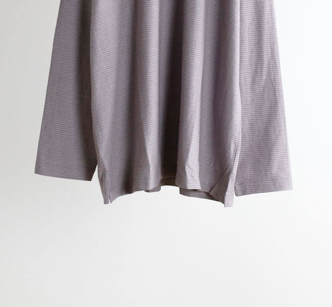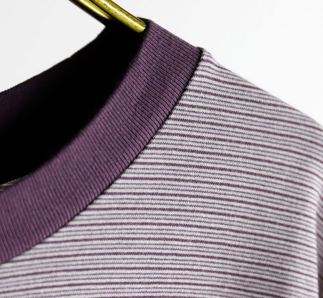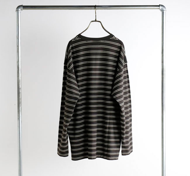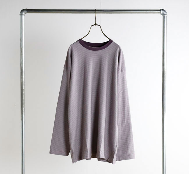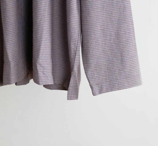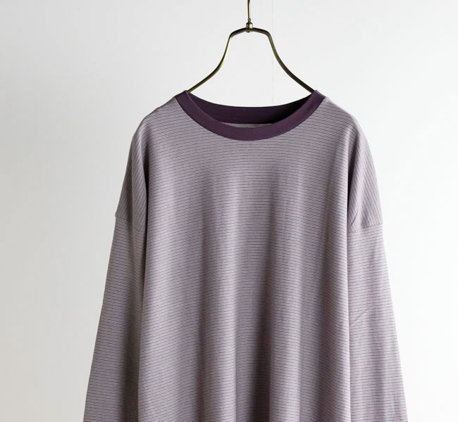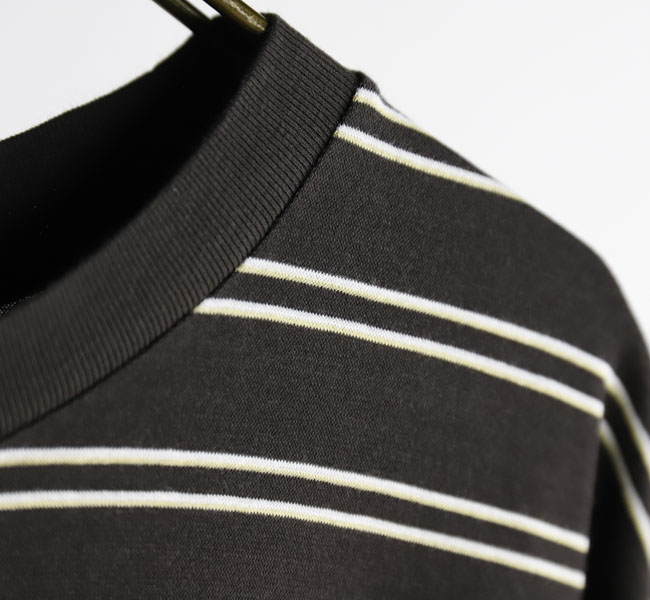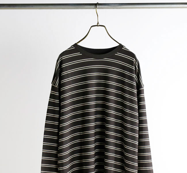 異種強撚糸同士を引き揃え、しっかりと度目を詰めて編み上げたハイツイスト‧コットン天竺ボーダー素材です。
