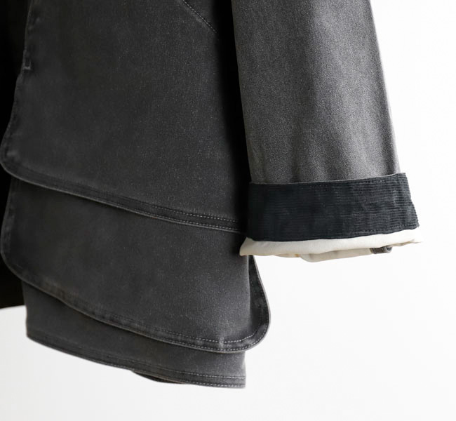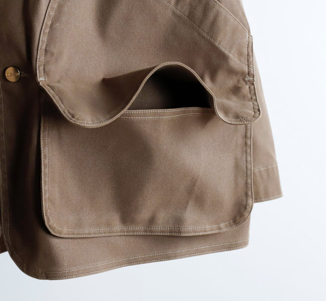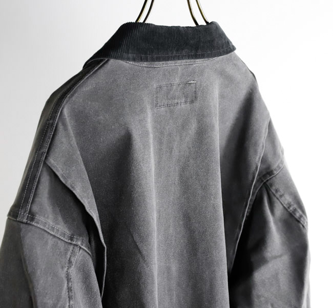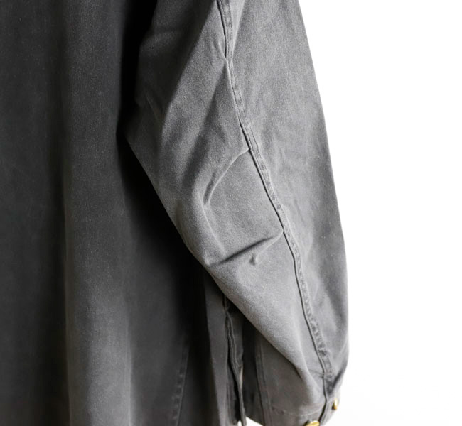 糸自体が均一な太さではなく乱雑な形状をしている為、非常にマットでコットンのような表情とナチュラルなタッチ、またコットンダックにはない軽さとストレッチ性が特徴です。更に、織り上げた生地に特殊なプリントを施し、製品でストーンウォッシュを施すことで生地表面のプリントを落とし、ポリエステルでありながらまるで着古して経年変化したコットンダックのようなフェードした表情に仕上げています。
