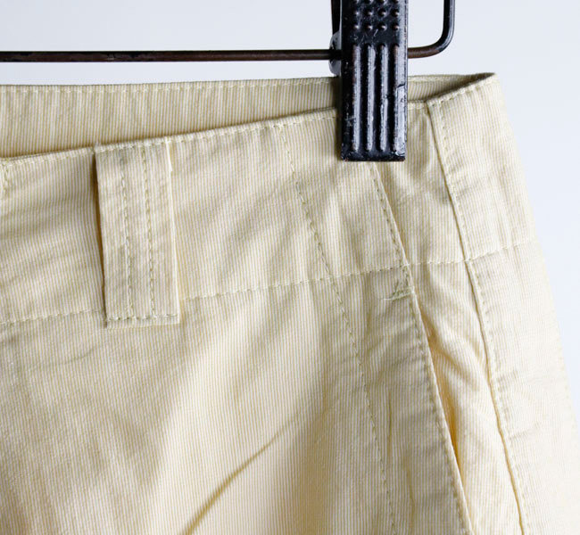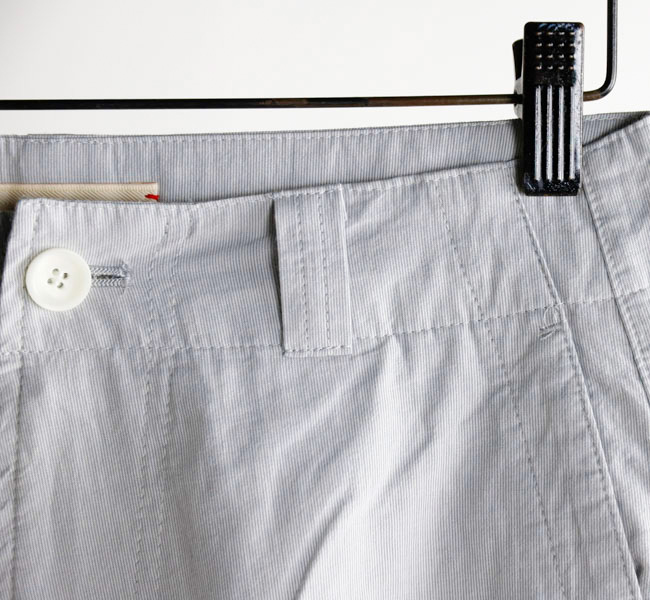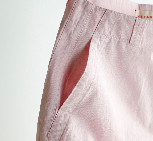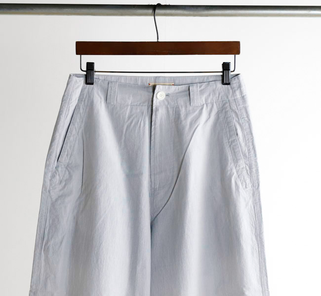 実は一見無地に見えて、よく見るとストライプという見た目にも二度楽しいパンツです。カラーは淡いトーン。