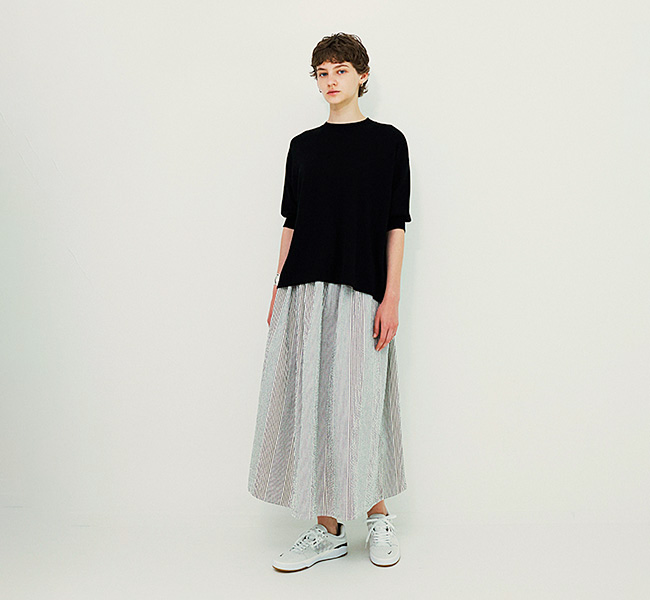 コットンを強く撚った糸は、シャリっとした肌触りで真夏でも肌にまとわりつかず爽やかな着心地。長い夏に欠かせないワードローブです。