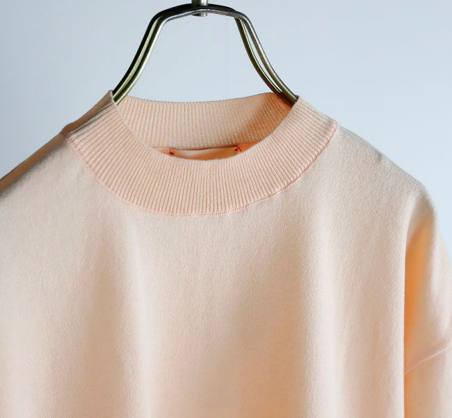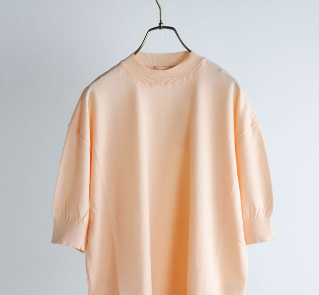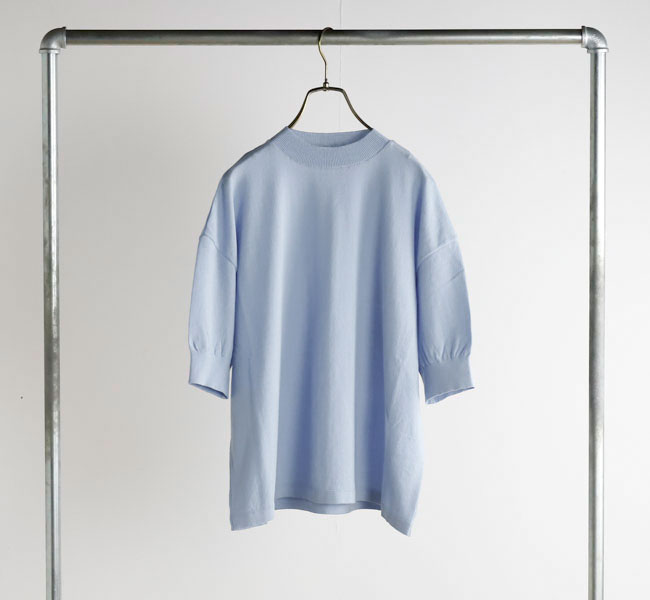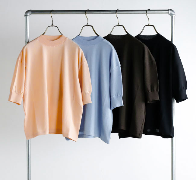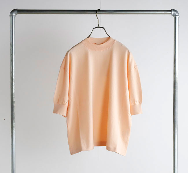 MEYAME の春夏の定番 COTTON KNIT TEE は色違いで揃えるリピーターが多いロングセラーアイテム。毎年カラーを変えて展開しています。
