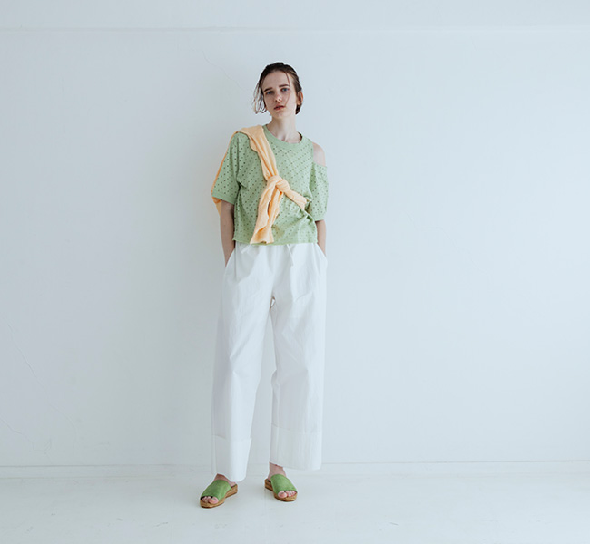 左側の肩部分に切り込みは実際に着てみると空きすぎずヘルシーな雰囲気なので、普通のTシャツを着る感覚で一味違った雰囲気を楽しめます。
