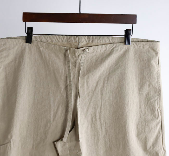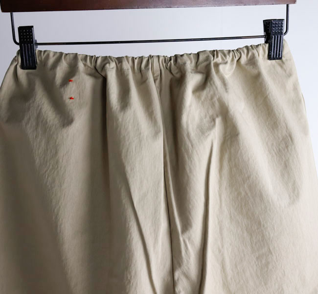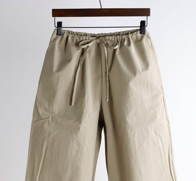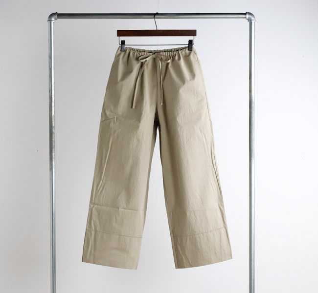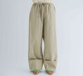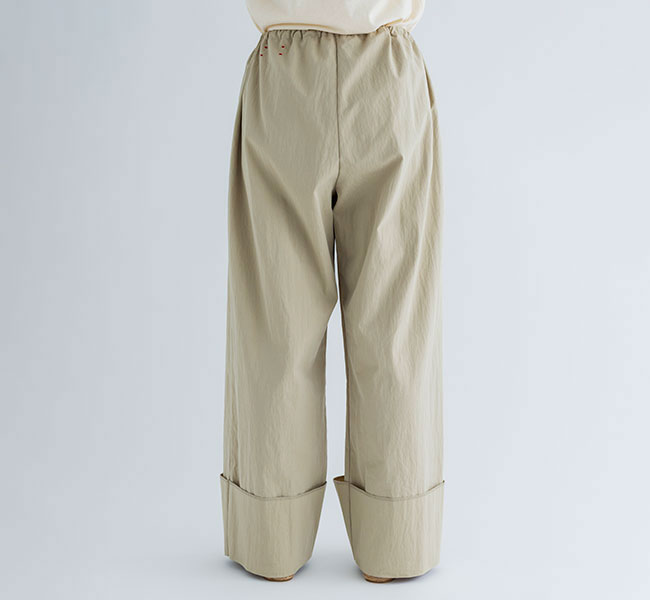 ワイドシルエットをウェストのコードでギュッと絞って履くパンツ。裾の深い折り返しのデザインが全体を引き締めてバランスを取りやすくしてくれます。