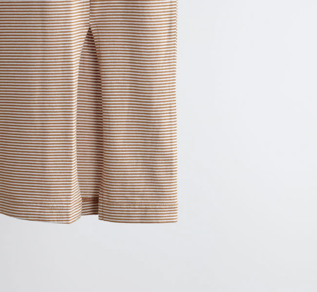 ボーダーはボーダーでも、ちょっと離れて見ると無地に見える細いボーダーは、カジュアルになり過ぎず大人の女性におすすめ。