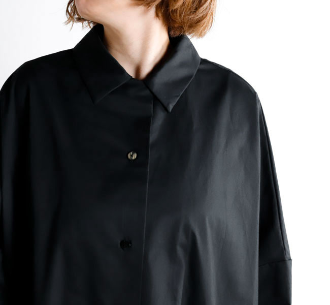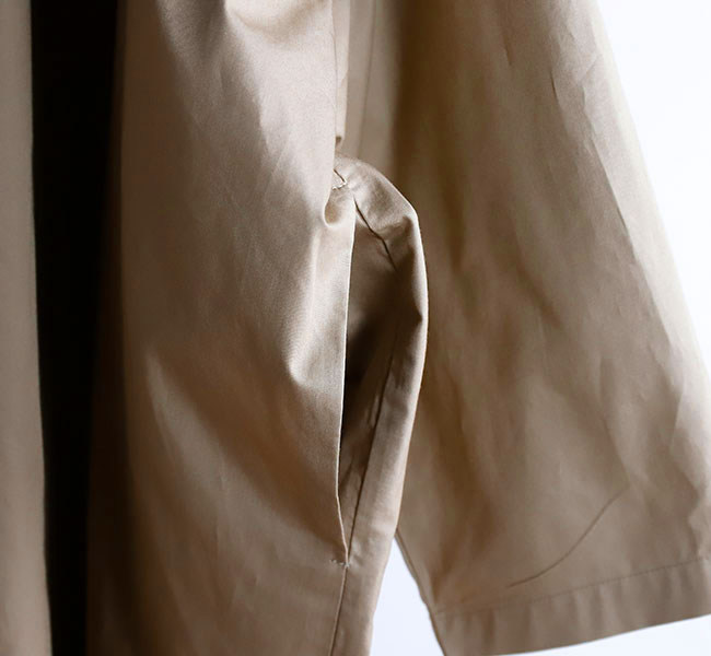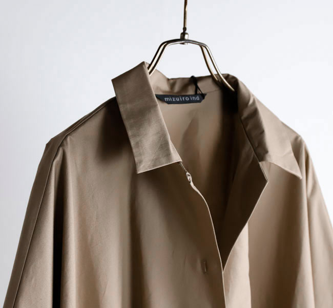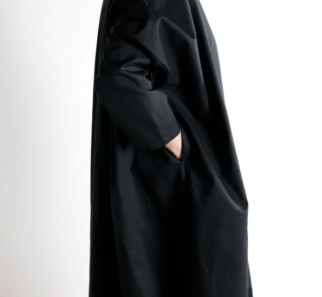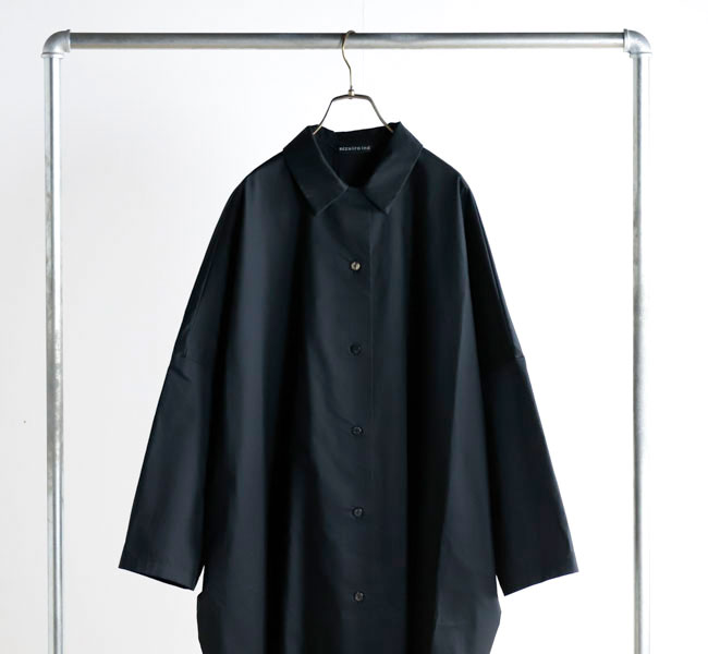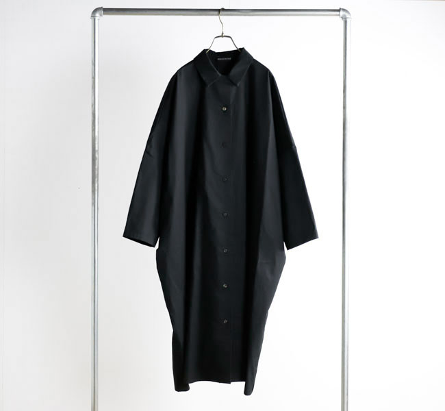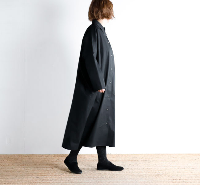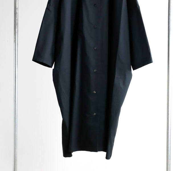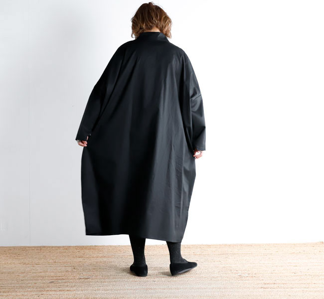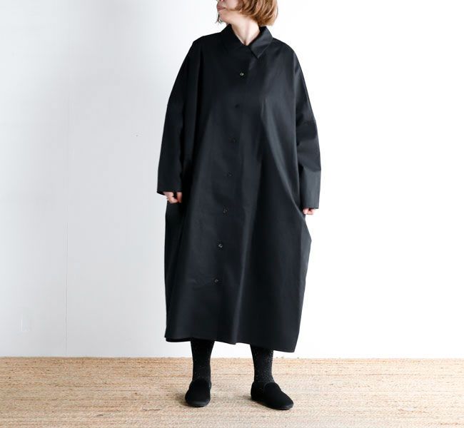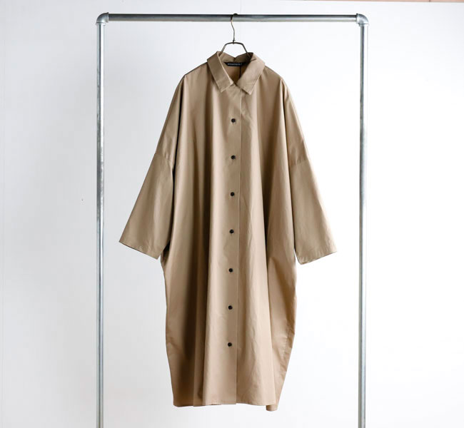 ゆったりと丸みのあるシルエットが印象的で、体のラインを拾いにくく、リラックス感のある着心地に仕上げました。前を閉じてワンピースとして、開けて羽織りとしても使えるためコーディネートの幅が広がる一枚です。素材には高密度コットンを使用し、程よいハリと上品さを兼ね備えたトラッドな雰囲気に。季節の変わり目には軽いコート感覚でも取り入れられ、長いシーズン活躍します。