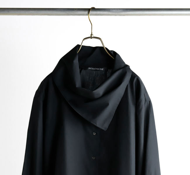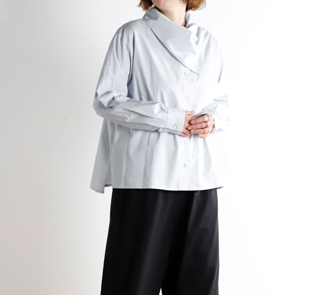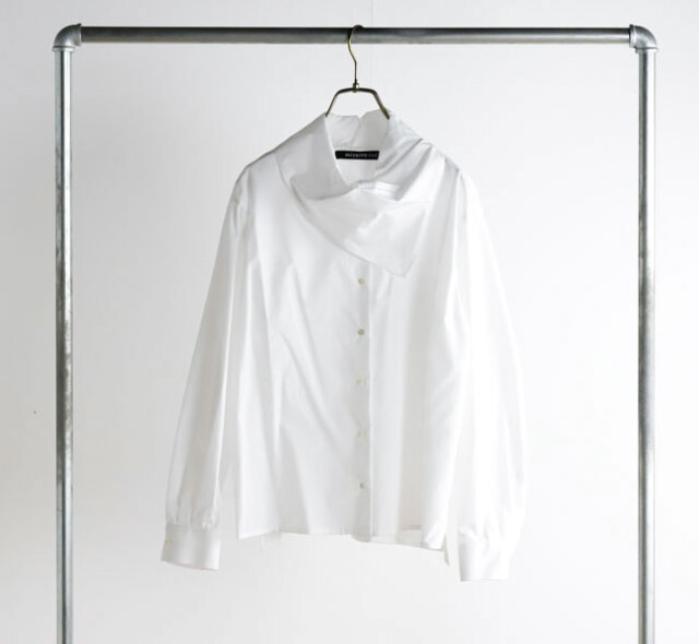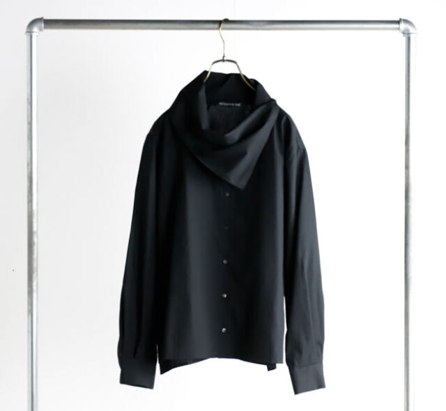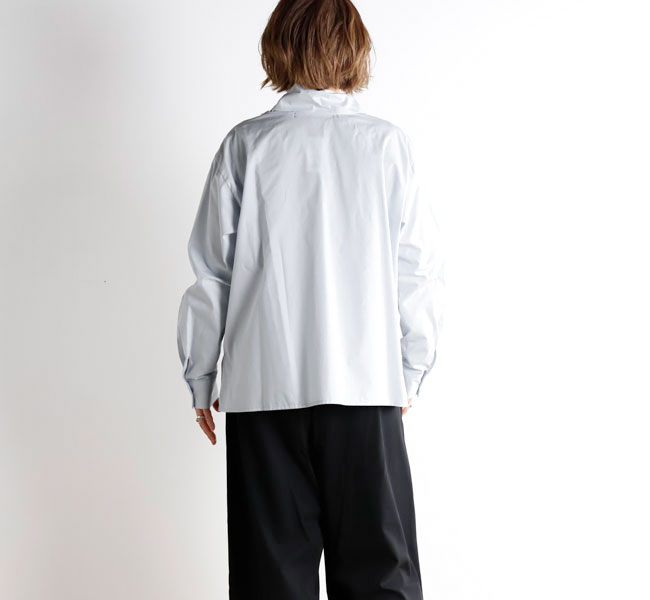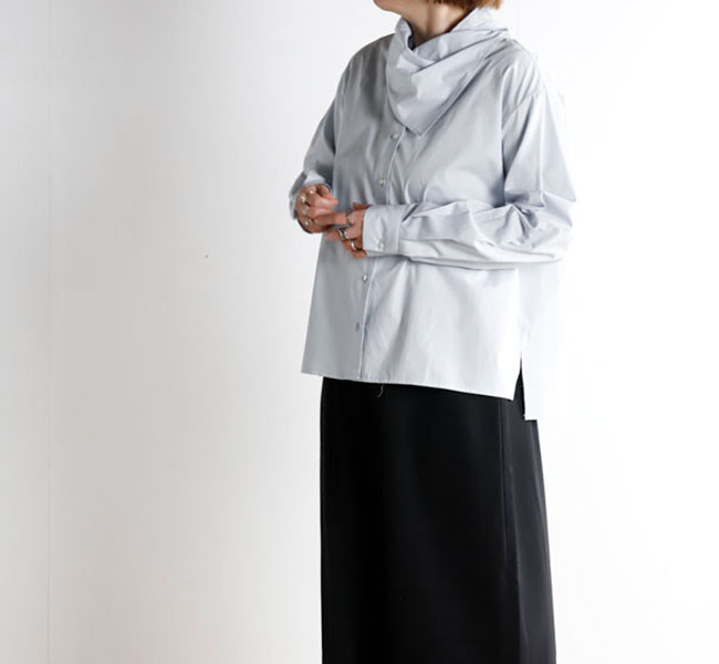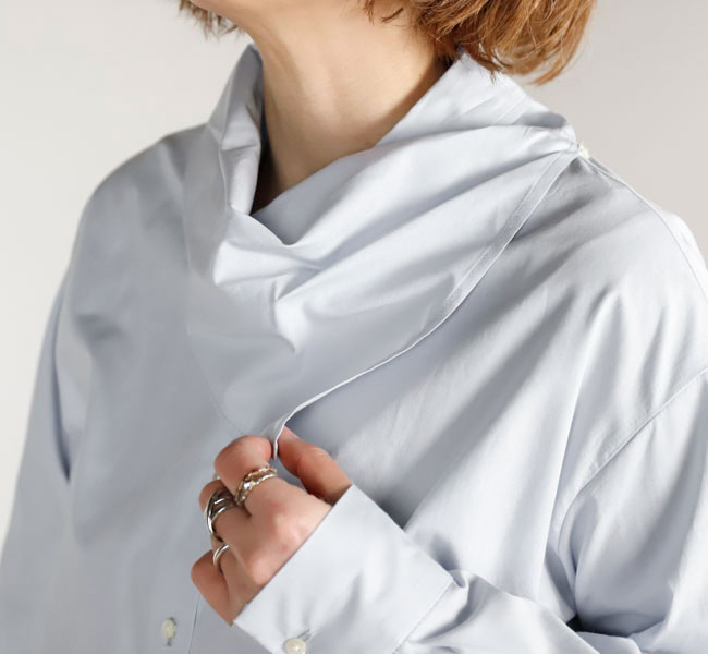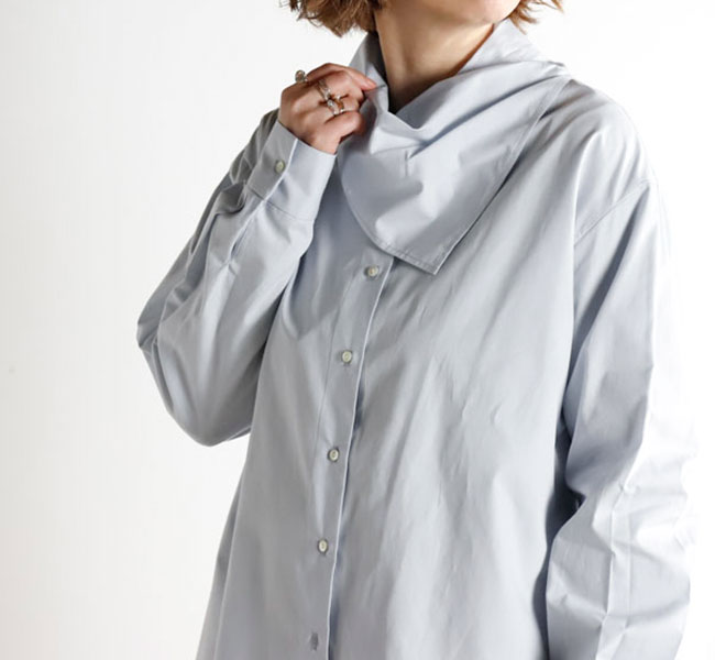 襟にドッキングしたスカーフが特徴のスカーフカラーシャツ。左肩上の小さいボタンで留められる仕様で、首を軽く包んでくれるシャツコーデを演出。首元のスカーフがアクセントになるデザインなので、オケージョン対応にもお勧め。50ブロード生地を使用。若干の前後差を付けており、サイドスリットが入っているので動きやすいデザイン。