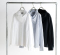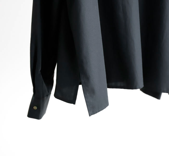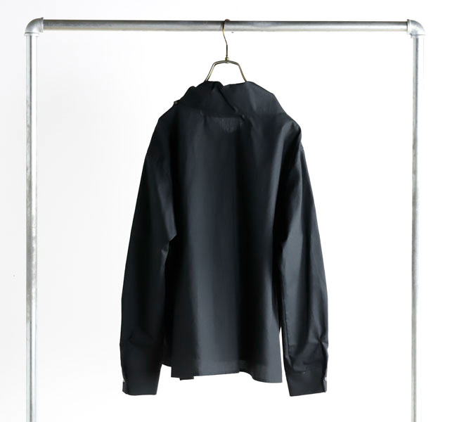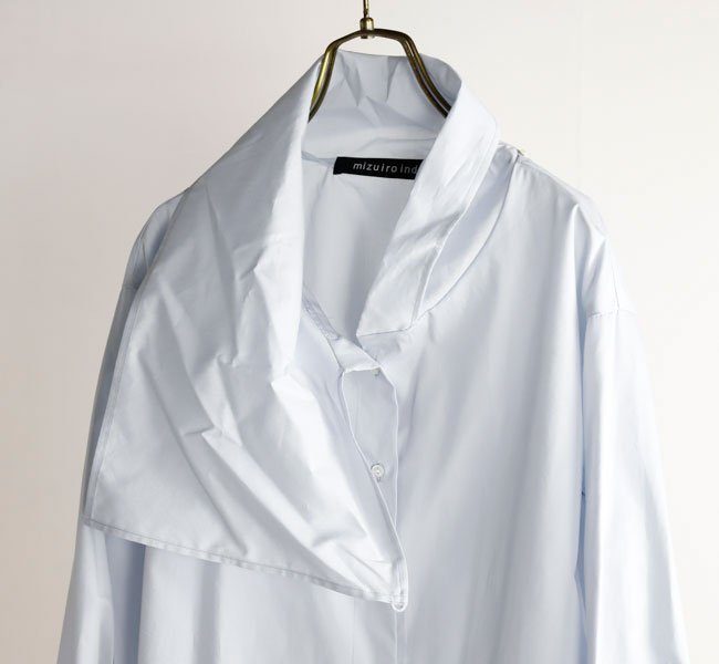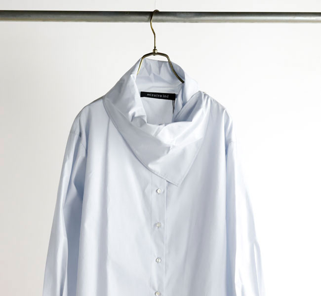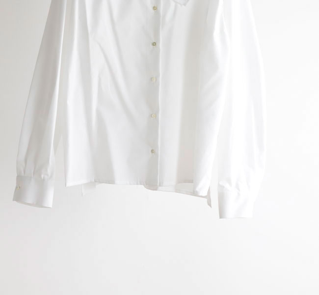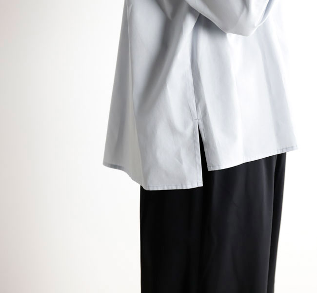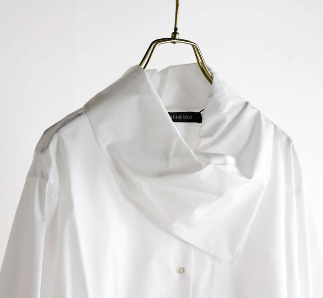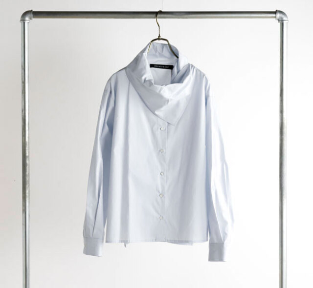 襟にドッキングしたスカーフが特徴のスカーフカラーシャツ。左肩上の小さいボタンで留められる仕様で、首を軽く包んでくれるシャツコーデを演出。首元のスカーフがアクセントになるデザインなので、オケージョン対応にもお勧め。50ブロード生地を使用。若干の前後差を付けており、サイドスリットが入っているので動きやすいデザイン。