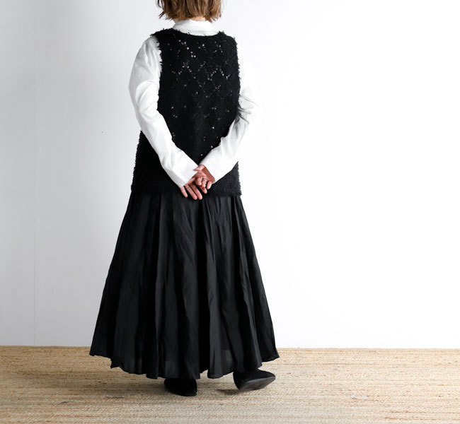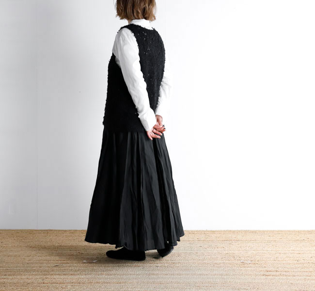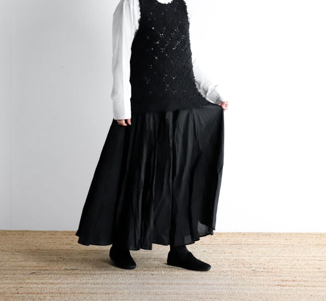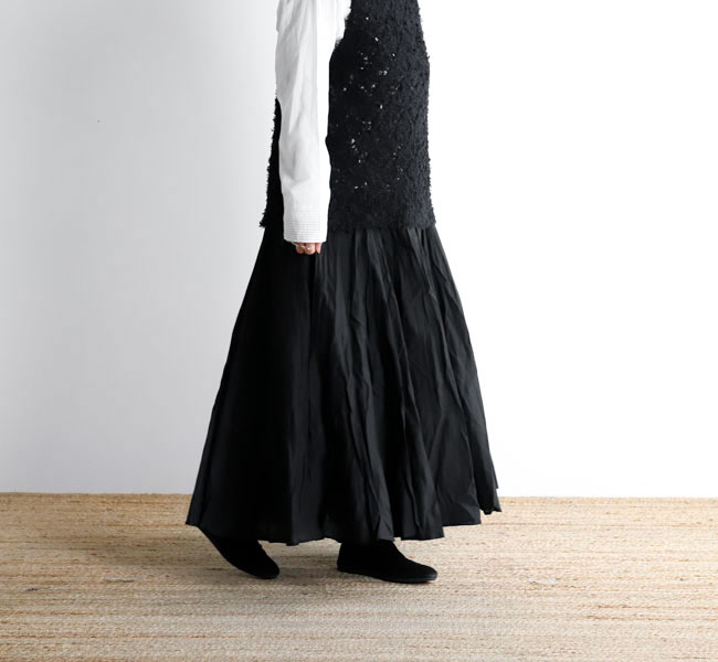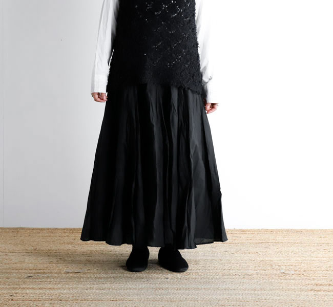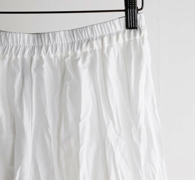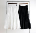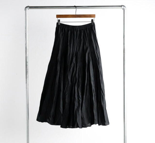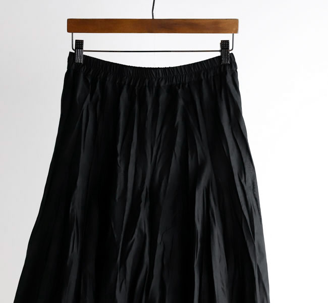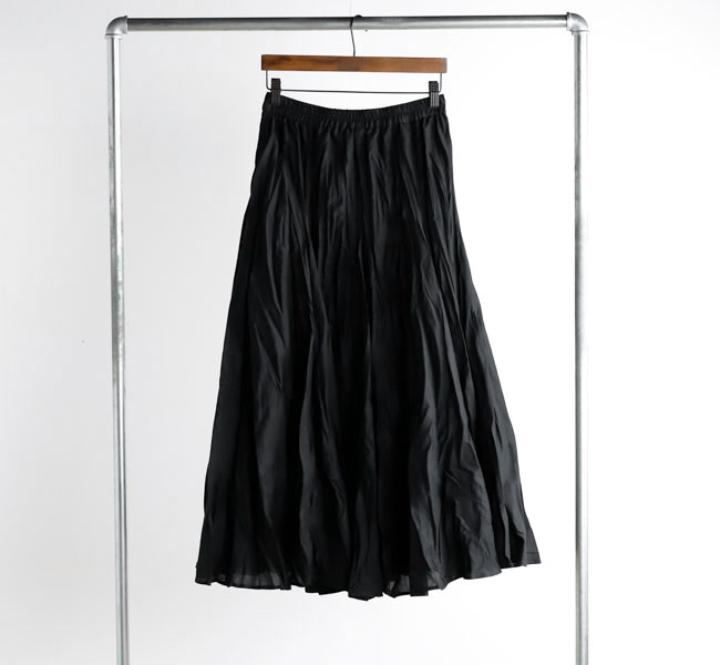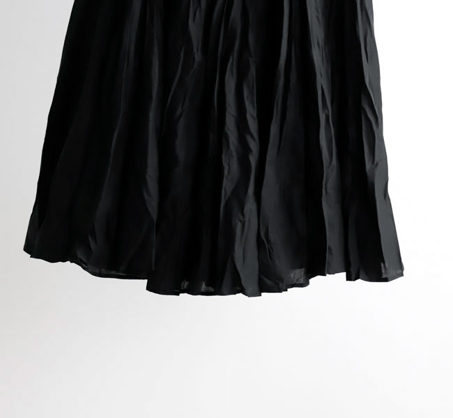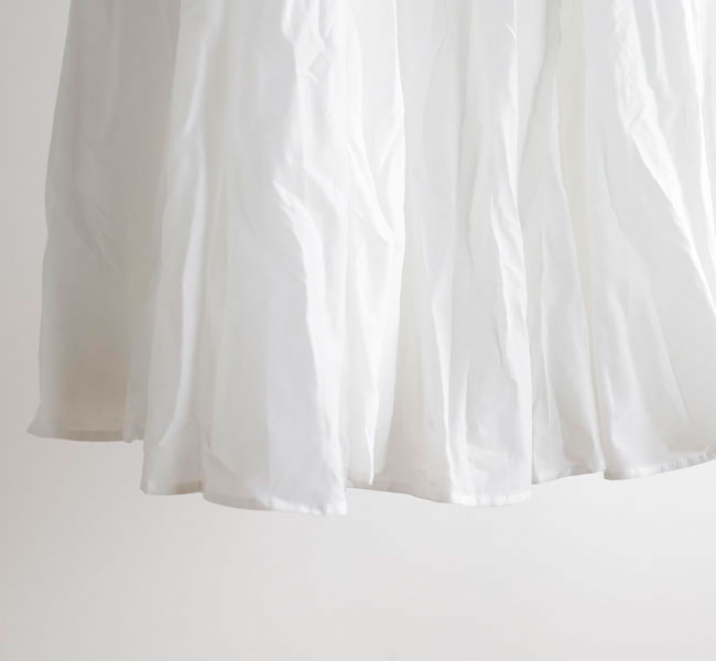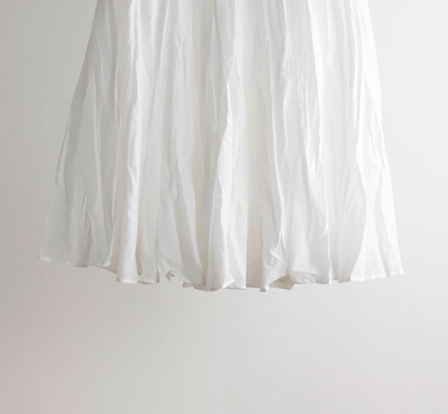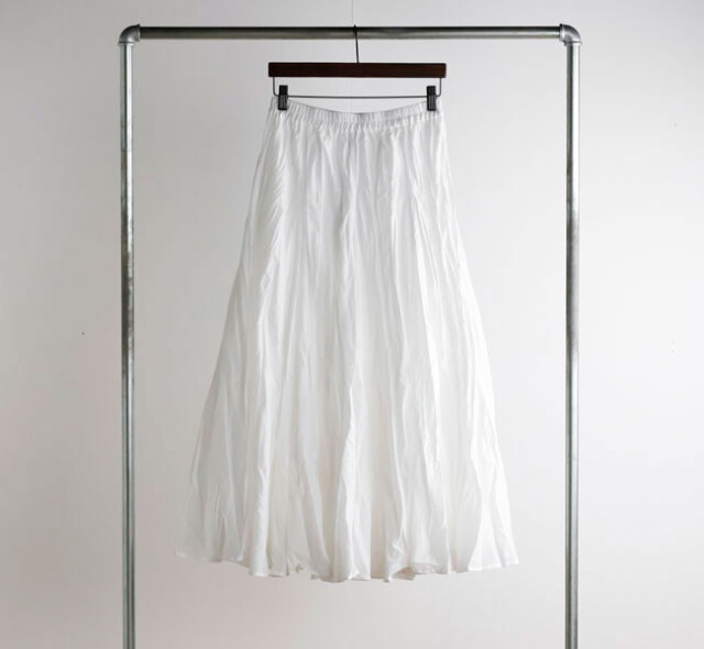 コットンローンを使用したボリュームフレアスカート。裾にかけボリューム感があり女性らしいフレアラインが魅力の1枚。シワを全体に施した雰囲気のあるデザインで入荷の際はあえてねじり巻いた状態になっているほど。お洗濯後もねじって収納してOK。同色の裏地が付いているので透け感も気にせず穿いていただけます。フレアなシルエットでコットン素材なのでオールシーズン活躍できるのもポイント。