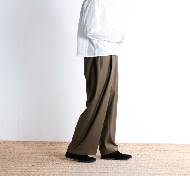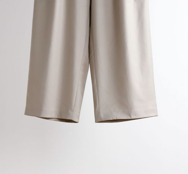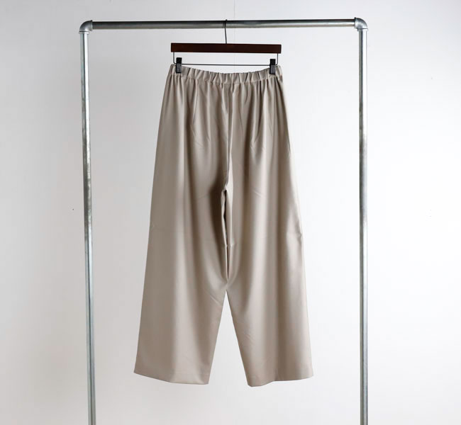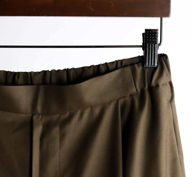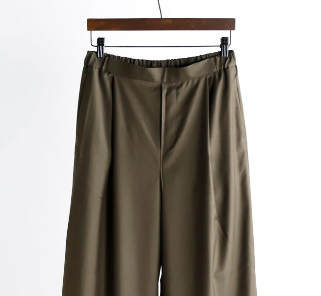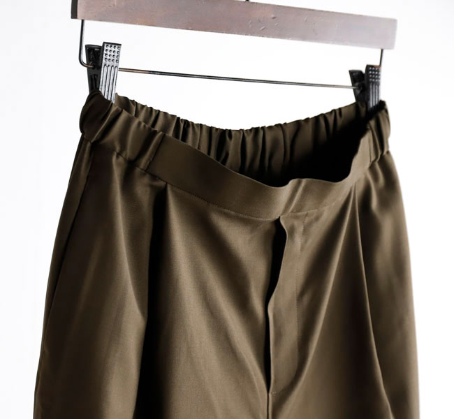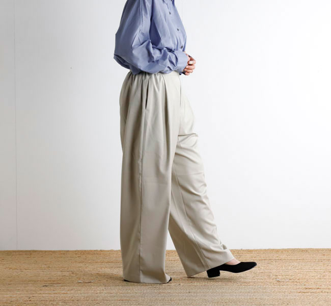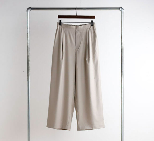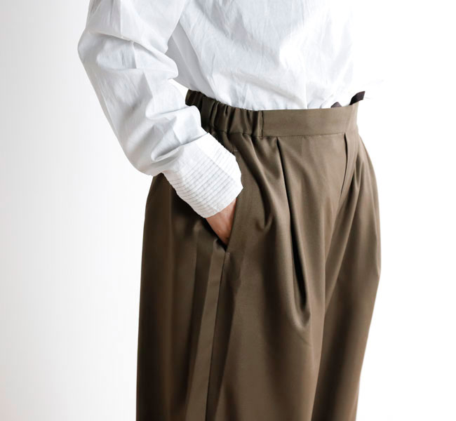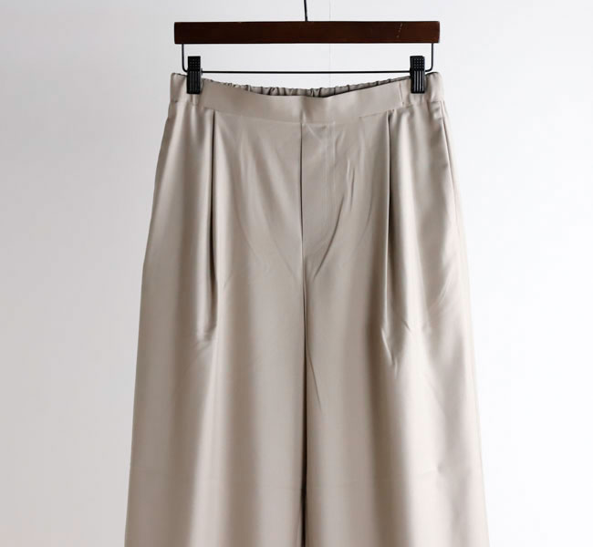 程よい光沢ととろみのある素材で上品な着こなしを演出するツータックスラックスです。ウエストにタックを施したストレートシルエットのベーシックなデザインを表現。フロント面はフラットに仕上げており、バック部分のみゴムを使用。中紐を付けているのでウエストキープのしやすいデザインになっています。ジャケットやジレ、シャツで合わせていただくとオケージョン対応にもなり、季節の変わり目に重宝できるお勧めの1枚です。