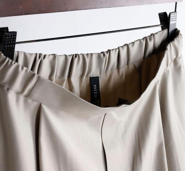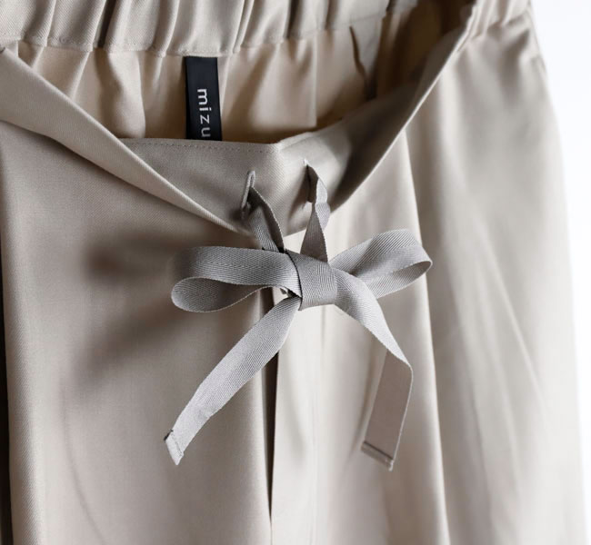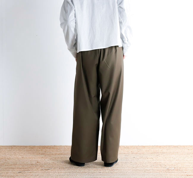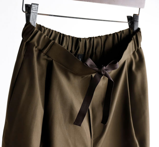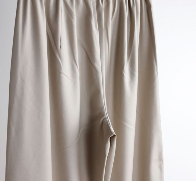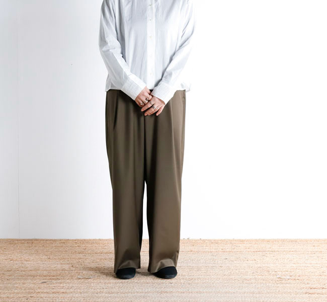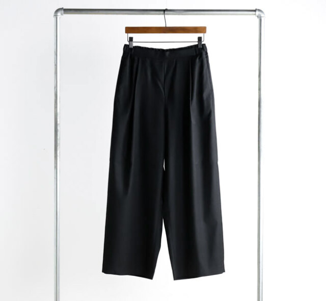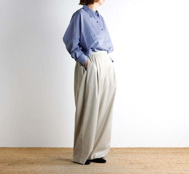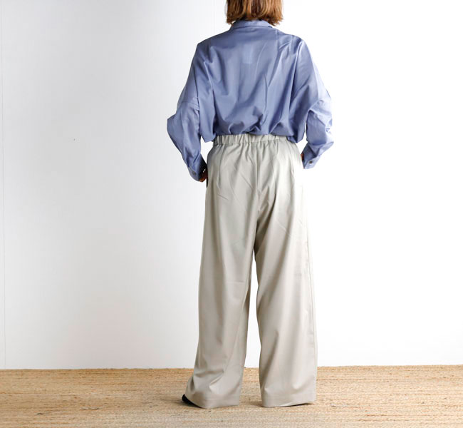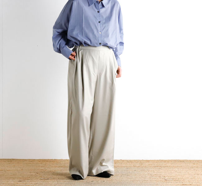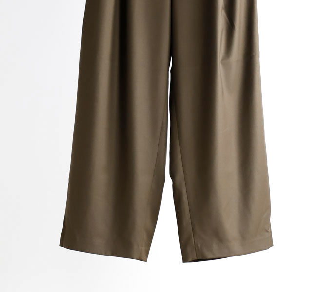 程よい光沢ととろみのある素材で上品な着こなしを演出するツータックスラックスです。ウエストにタックを施したストレートシルエットのベーシックなデザインを表現。フロント面はフラットに仕上げており、バック部分のみゴムを使用。中紐を付けているのでウエストキープのしやすいデザインになっています。ジャケットやジレ、シャツで合わせていただくとオケージョン対応にもなり、季節の変わり目に重宝できるお勧めの1枚です。