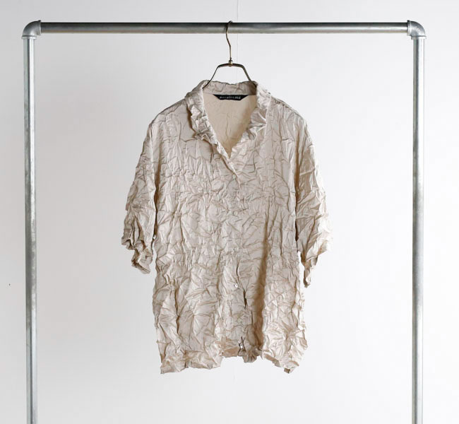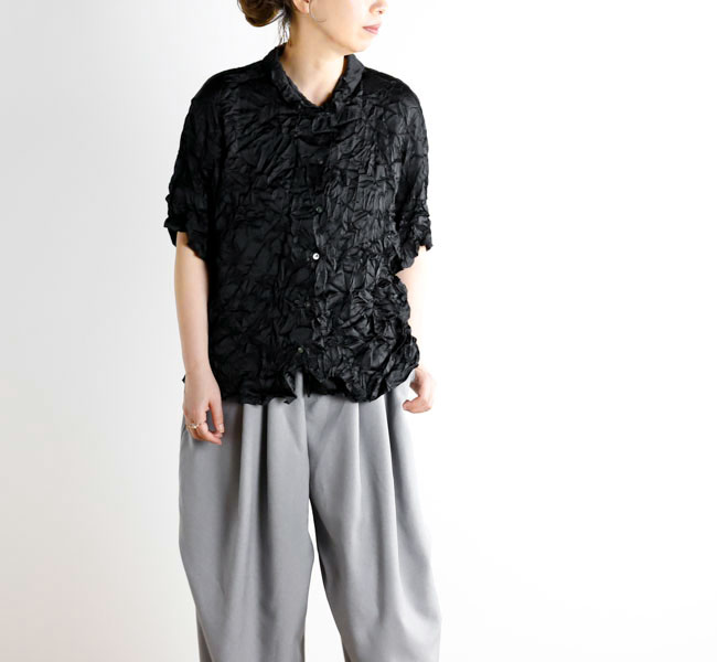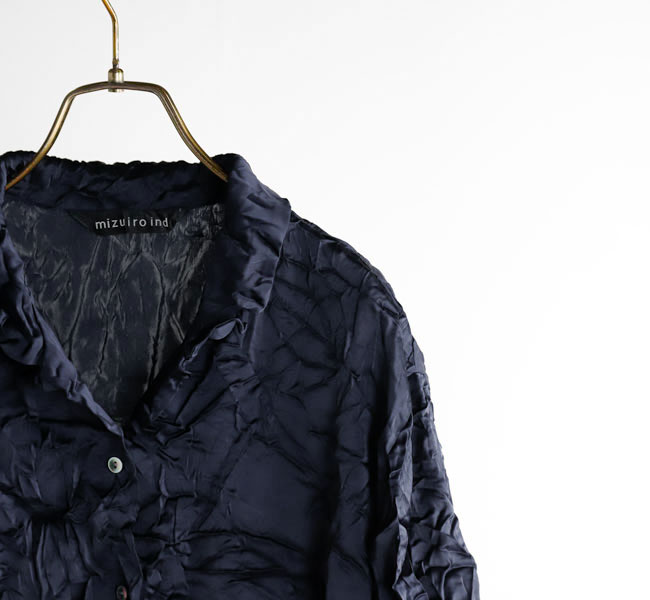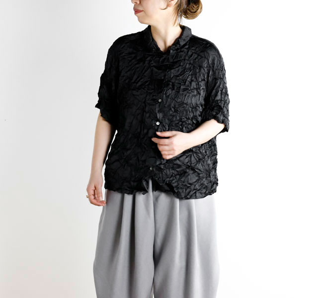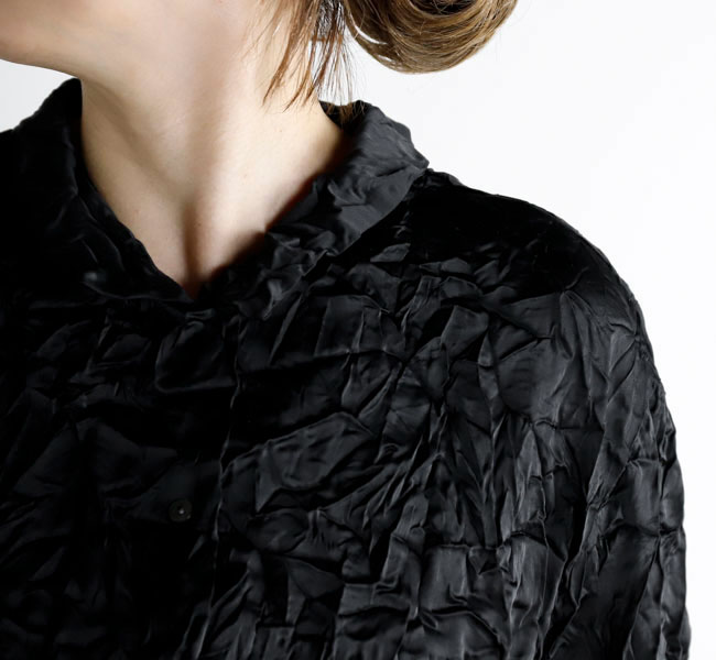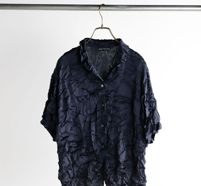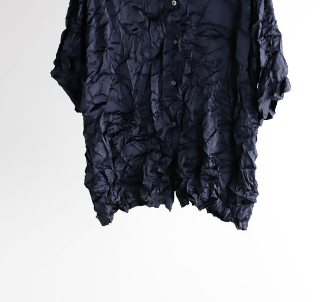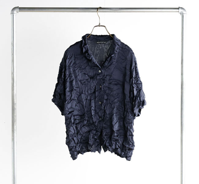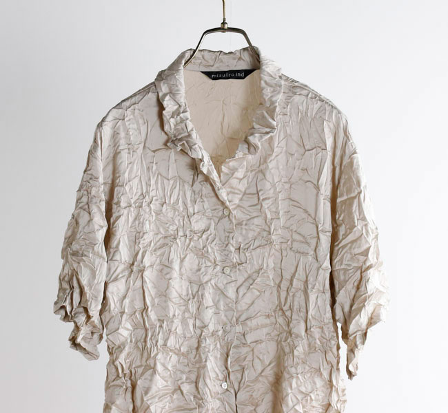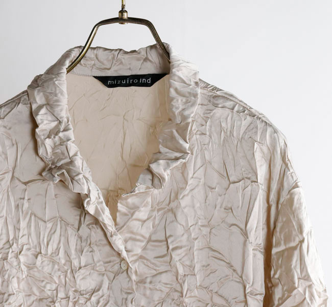 サテン地にワッシャー加工を加えたワッシャーハーフスリーブシャツです。シャツ全体がクシャっとしたデザイン仕上げで雰囲気のあるmizuiro indらしいシャツ。小さめのすっきりとした襟にもしっかりとワッシャーが入っています。ヒップにかかるほどの丈感と肘の隠れる袖丈が特徴。羽織って着用しても良し、1枚で様々なアイテムにコーディネート可能。サテン生地なのでサラッとしており夏場も快適に着用していただけます。
