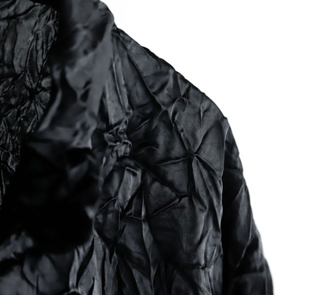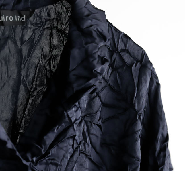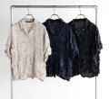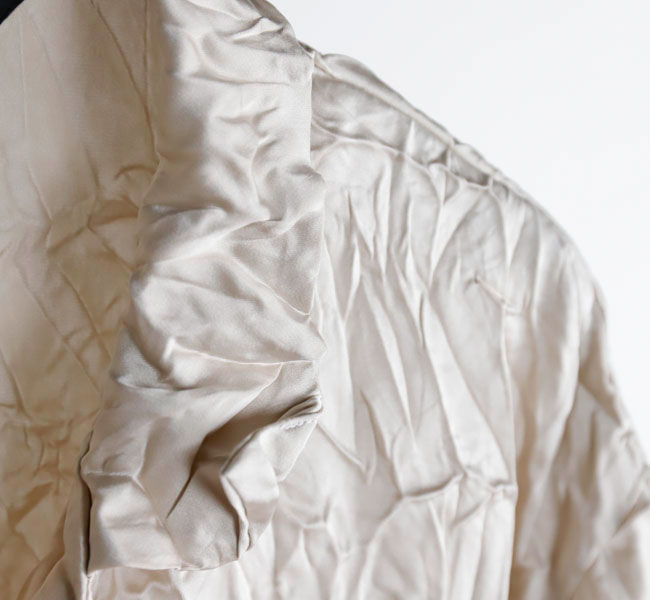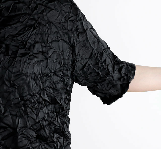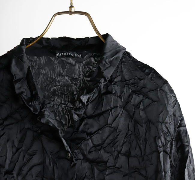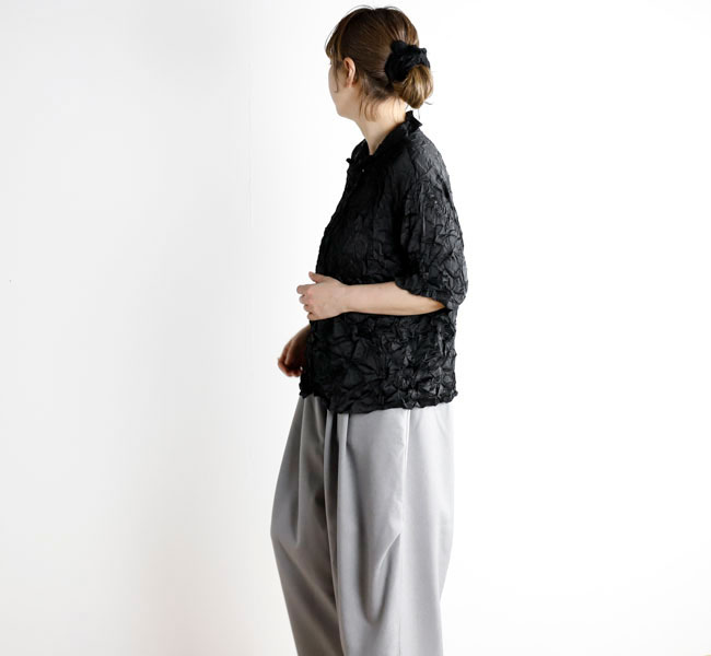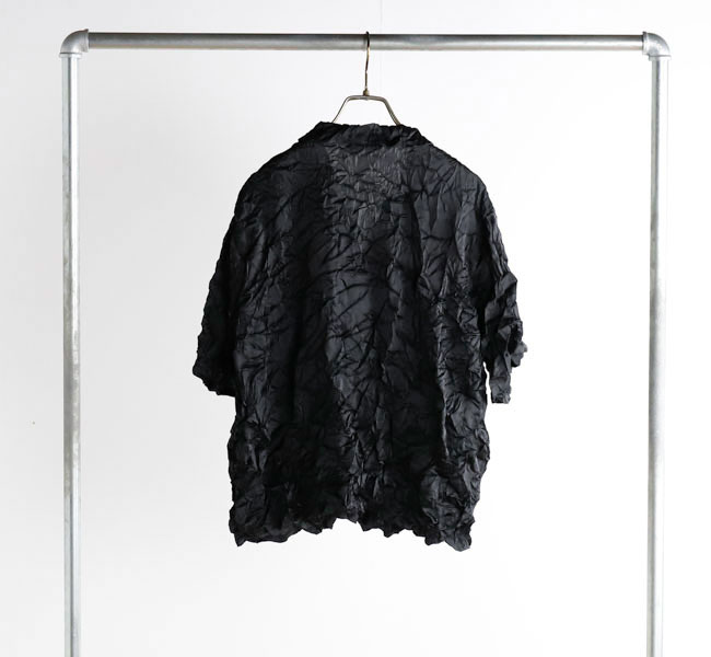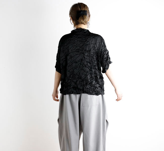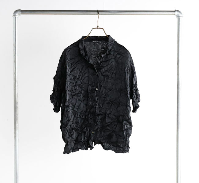 サテン地にワッシャー加工を加えたワッシャーハーフスリーブシャツです。シャツ全体がクシャっとしたデザイン仕上げで雰囲気のあるmizuiro indらしいシャツ。小さめのすっきりとした襟にもしっかりとワッシャーが入っています。ヒップにかかるほどの丈感と肘の隠れる袖丈が特徴。羽織って着用しても良し、1枚で様々なアイテムにコーディネート可能。サテン生地なのでサラッとしており夏場も快適に着用していただけます。