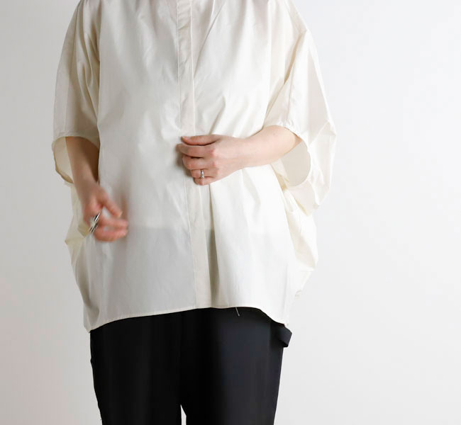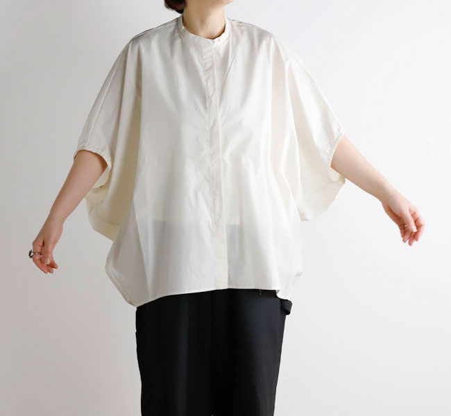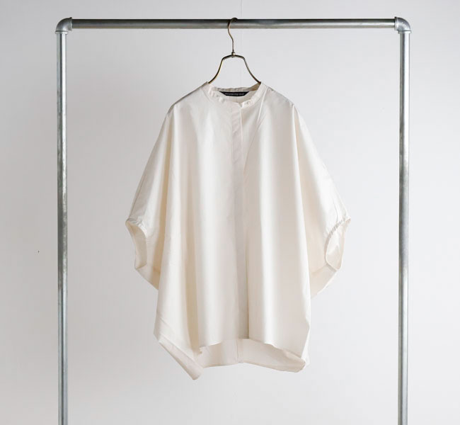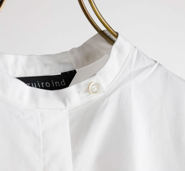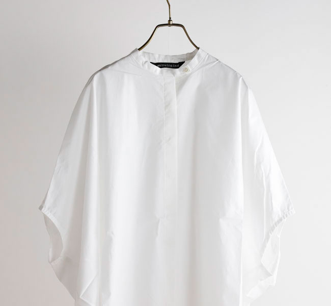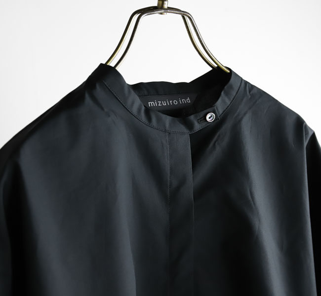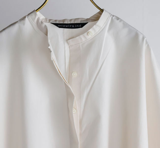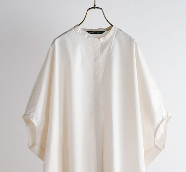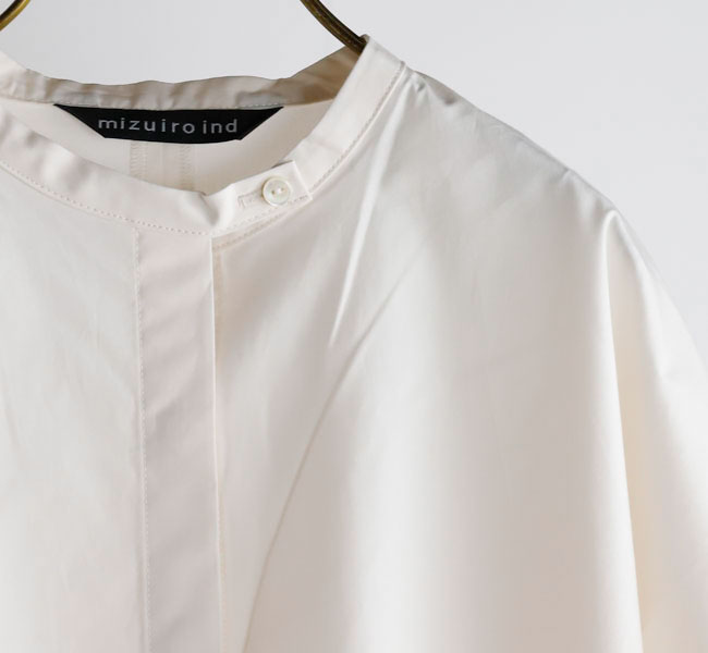 mizuiro ind人気のアイテムでもある、スタンドカラーコクーンシャツ。落ち着きのある女性らしい雰囲気を印象付けるアイボリーが今季お勧めカラーとなっています。60スーピマタイプライターを使用した定番シャツといって良いお勧めのデザイン。すっきりとしたスタンドカラーの首元と、サイドにボリューム感のあるシルエットが特徴的。フロントボタンは比翼仕立てになっており、よりすっきりとしたシンプルな仕上がりになっています。着回しもしやすく長く愛用していただけるのもポイント。ヒップまで隠れる丈は様々なボトムアイテムとの相性がよく、魅力的にコーディネートができる1枚。