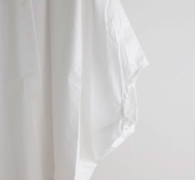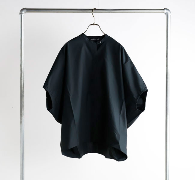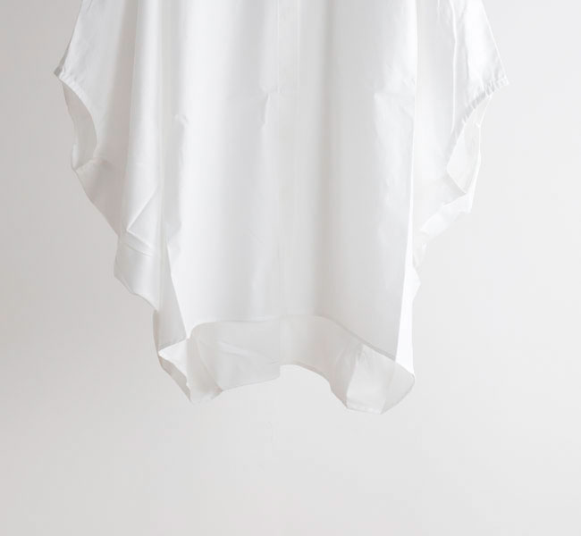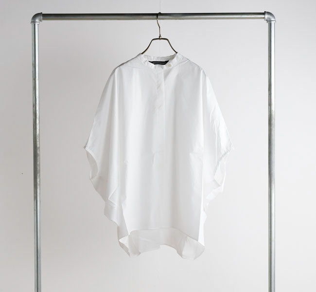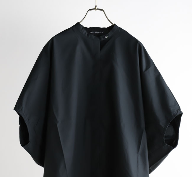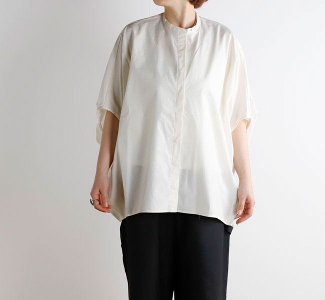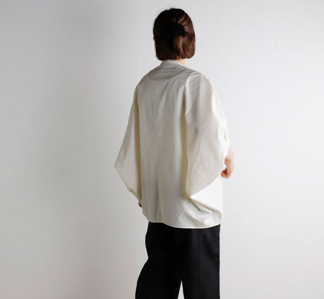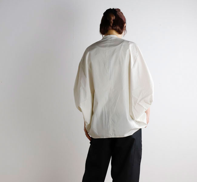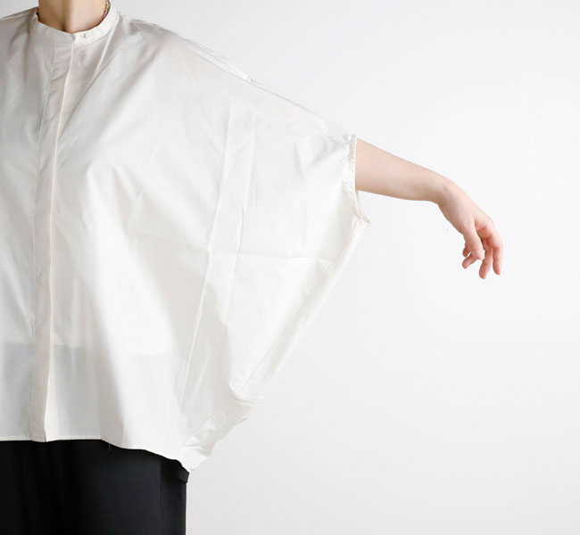 mizuiro ind人気のアイテムでもある、スタンドカラーコクーンシャツ。落ち着きのある女性らしい雰囲気を印象付けるアイボリーが今季お勧めカラーとなっています。60スーピマタイプライターを使用した定番シャツといって良いお勧めのデザイン。すっきりとしたスタンドカラーの首元と、サイドにボリューム感のあるシルエットが特徴的。フロントボタンは比翼仕立てになっており、よりすっきりとしたシンプルな仕上がりになっています。着回しもしやすく長く愛用していただけるのもポイント。ヒップまで隠れる丈は様々なボトムアイテムとの相性がよく、魅力的にコーディネートができる1枚。