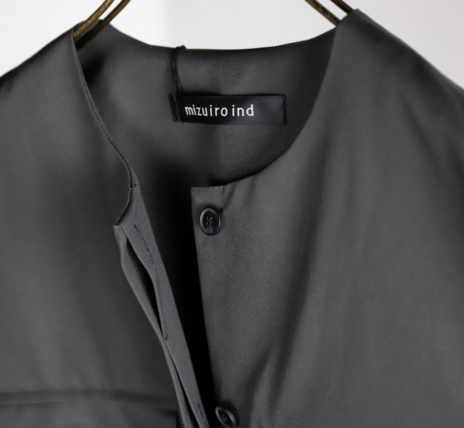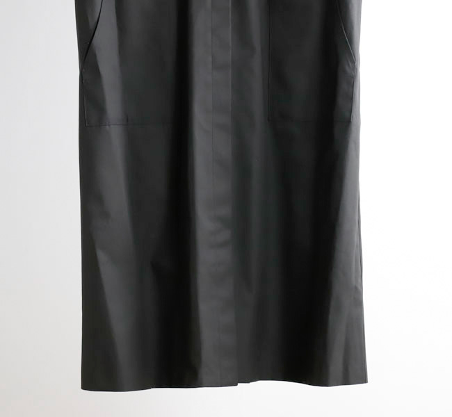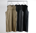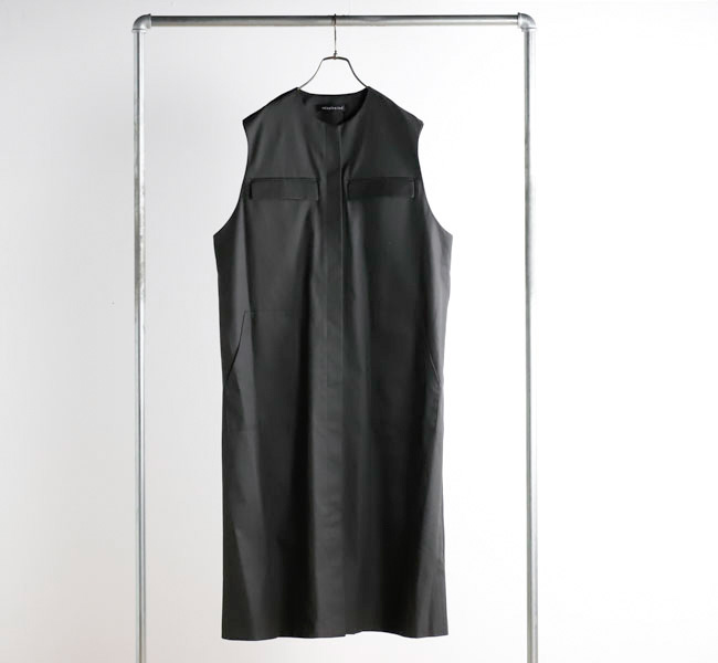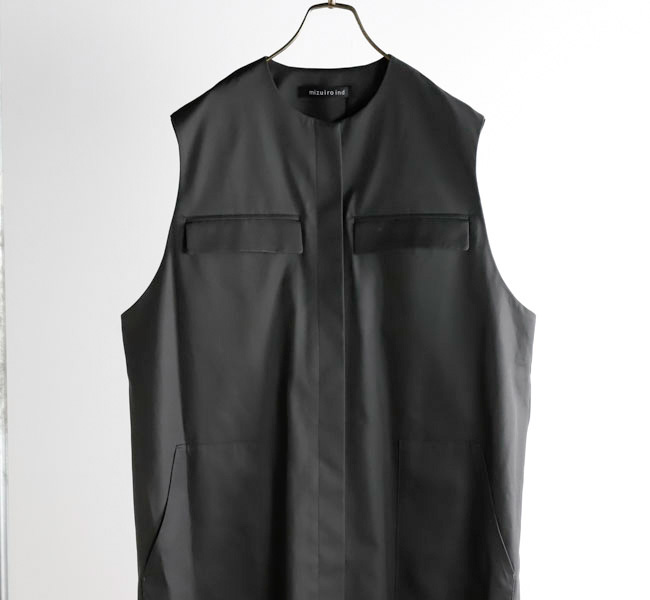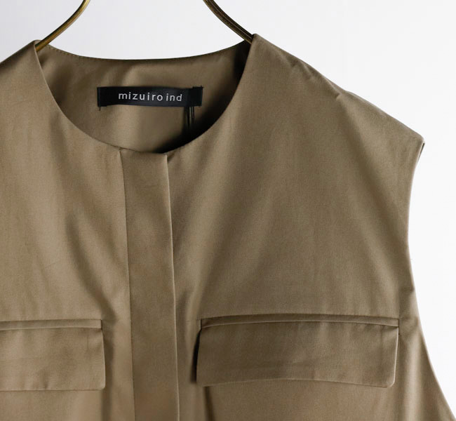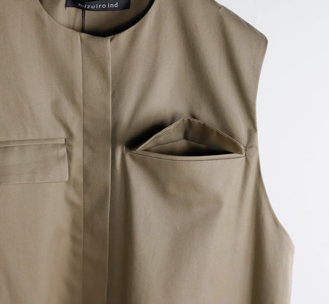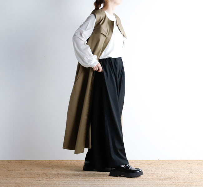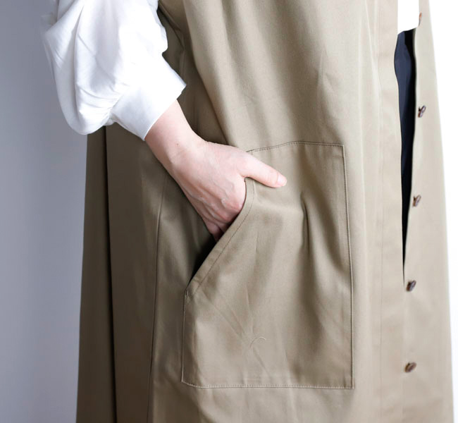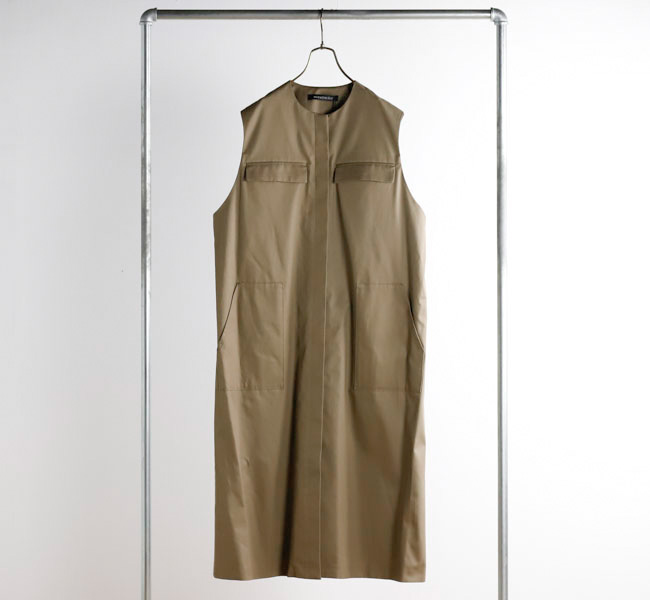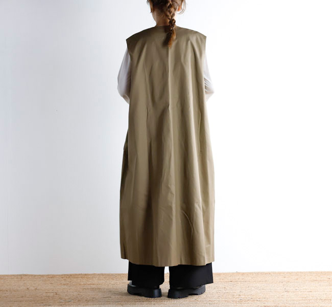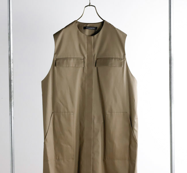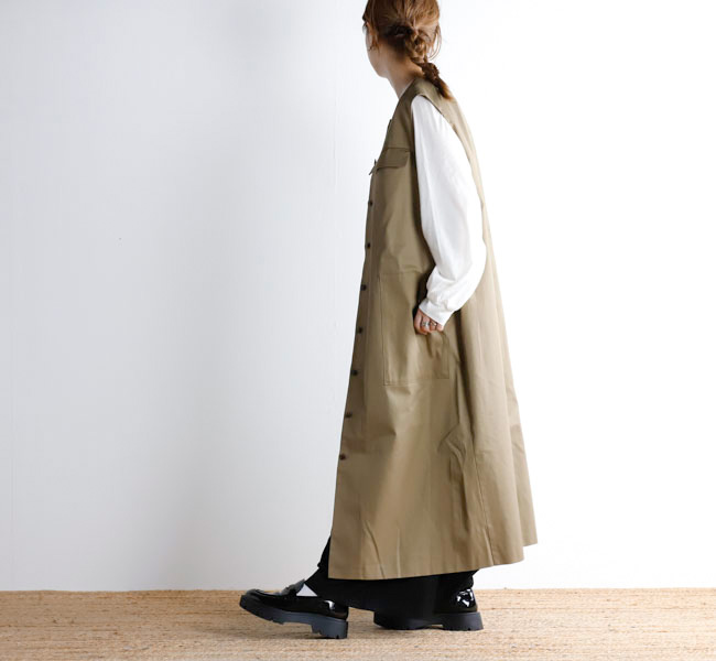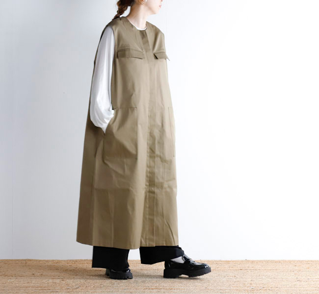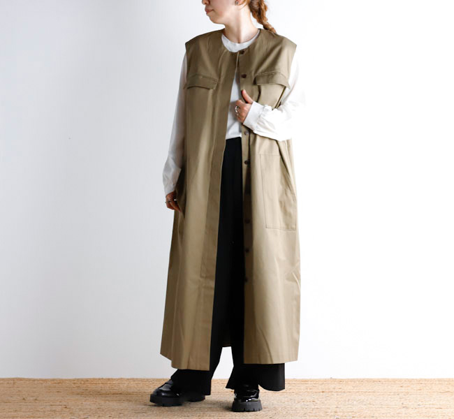 メンズライクなワーク調のデザインが特徴のポケット付クルーネックロングジレ。ジャケットの袖を落としたようなデザインを表現しました。長めの丈にしており、ワンピースでもジレとしても着こなしができる1枚です。フロントは比翼仕立てにしているのでよりすっきりとしています。しっかりとしたハリのある生地感で胸に蓋付ポケットが二つ、手がすっぽりと入る大き目のポケットが付いています。長めの丈ですが、小柄な方にも着こなせるロングジレです。