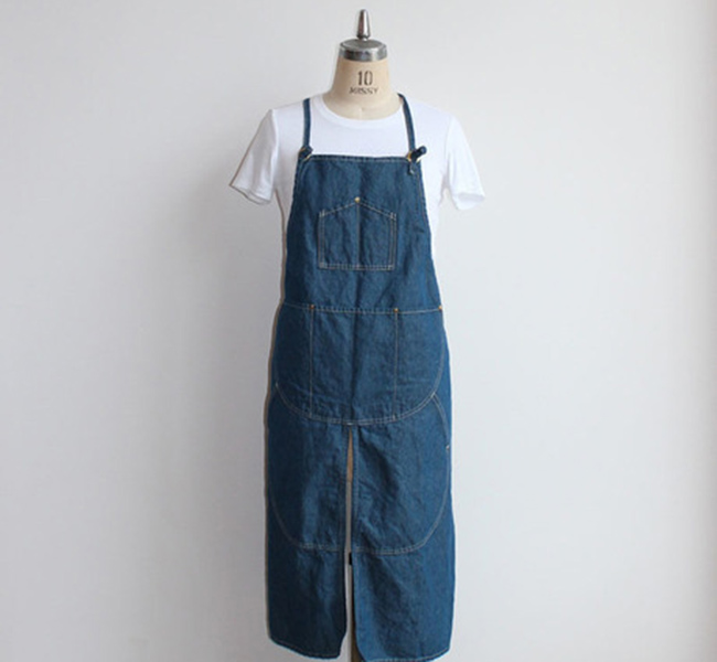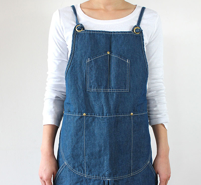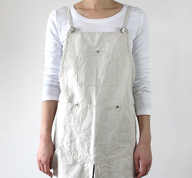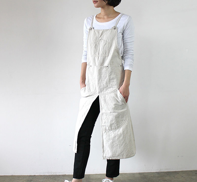 USビンテージエプロンからデザインを引用した一着。胸元や腹部、膝部にある当て布にまでもポケットが付いた機能的なエプロン。股部分が割れているのでしゃがみ作業や、階段の上り下りにも役立ちます。後ろはクロスタイプに着ることができる調整紐が付いているので首への負担も少なく長時間の着用も気になりません。