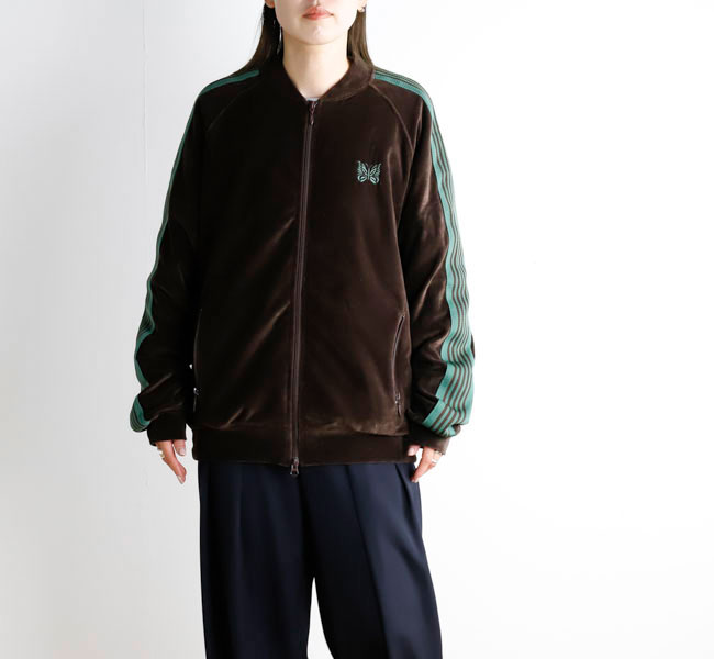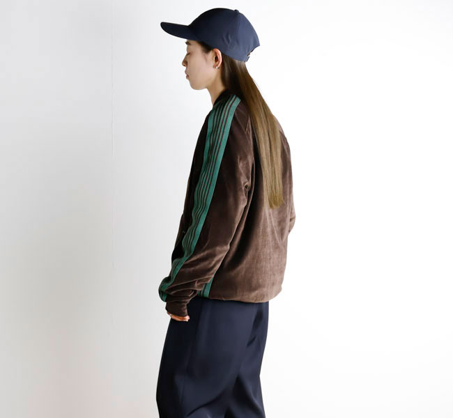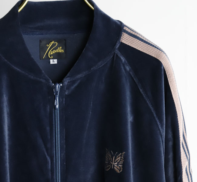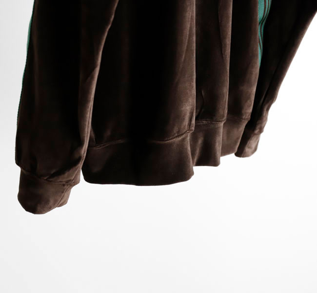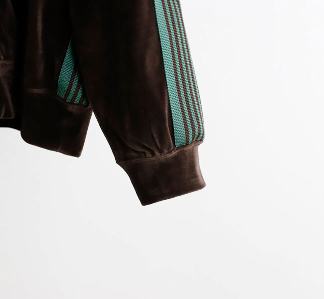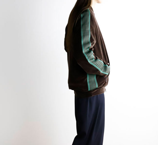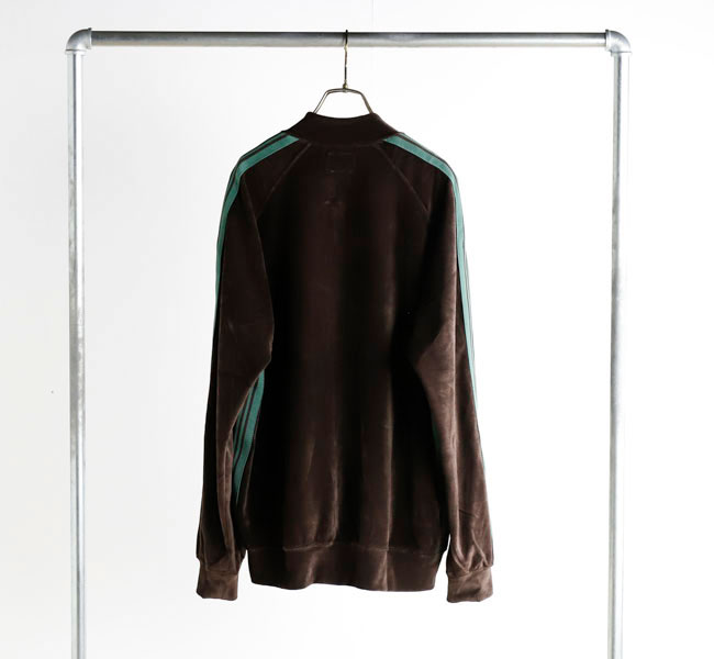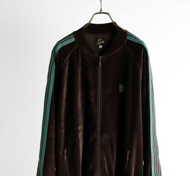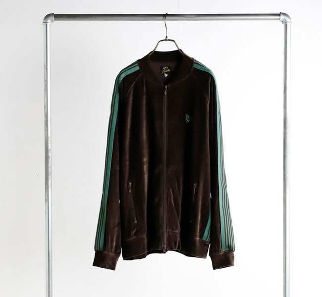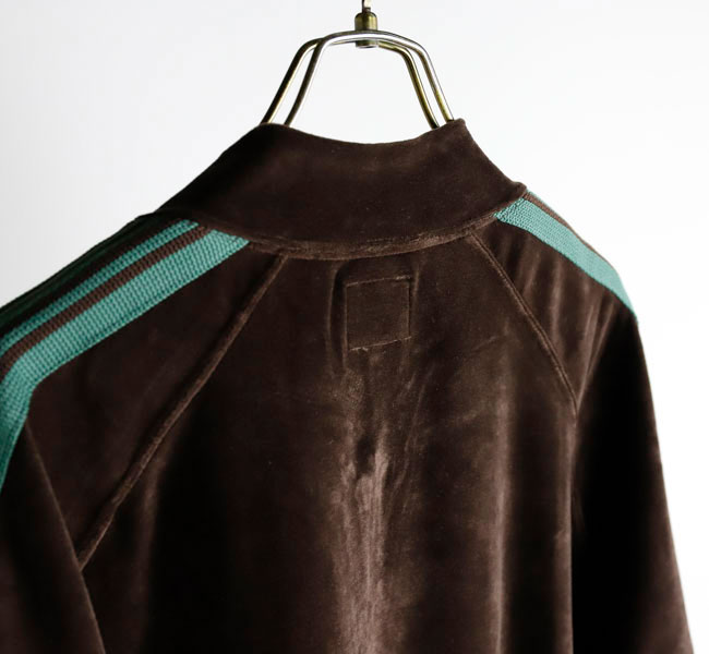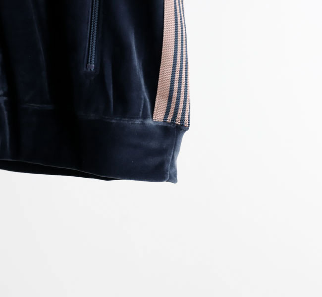 NEEDLES 26SS入荷です。定番のポリエステルジャージー素材と並んで人気の高い、ベロア素材を使用したトラックシリーズ。ソフトな発色と艶感のあるベロア特有のラグジュアリーな雰囲気が特徴的な一着です。首元はリブカラー仕様となっており、すっきりとしたスタイリッシュなイメージが強調されています。