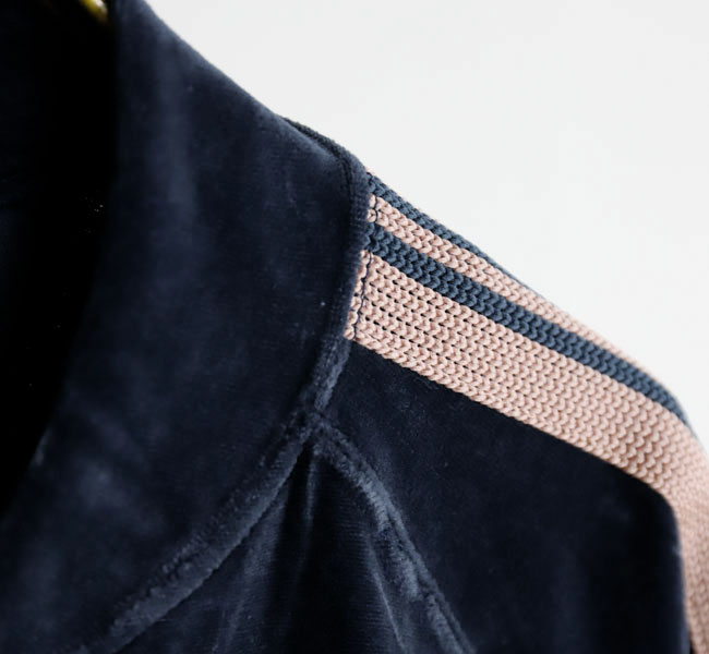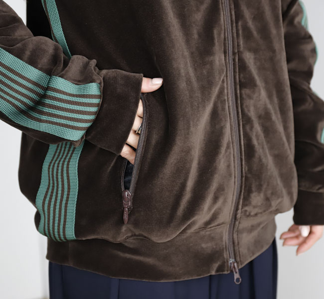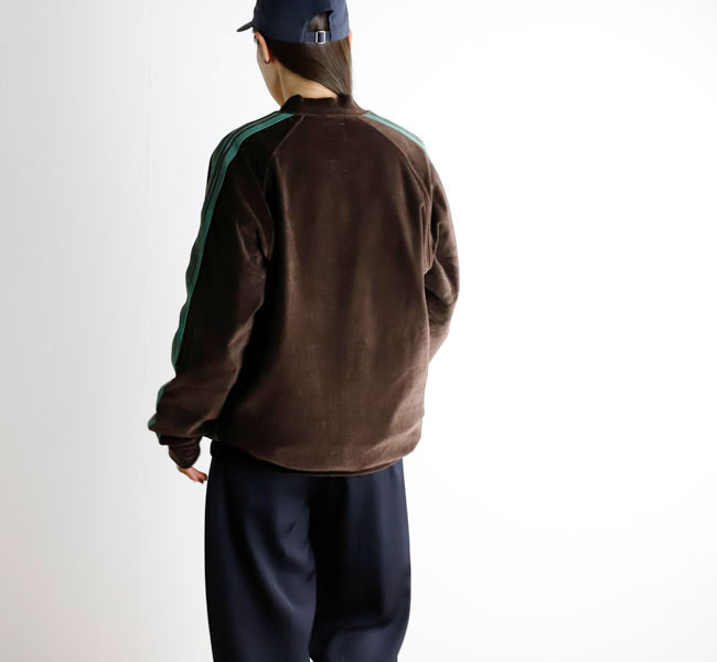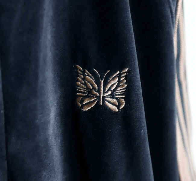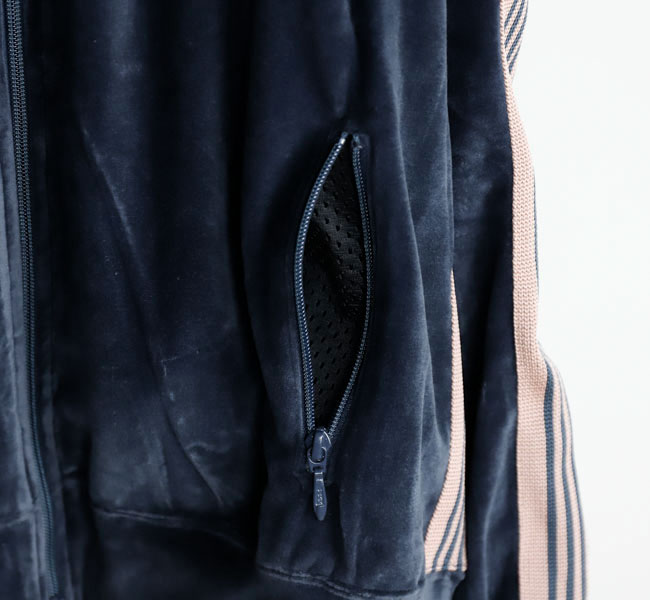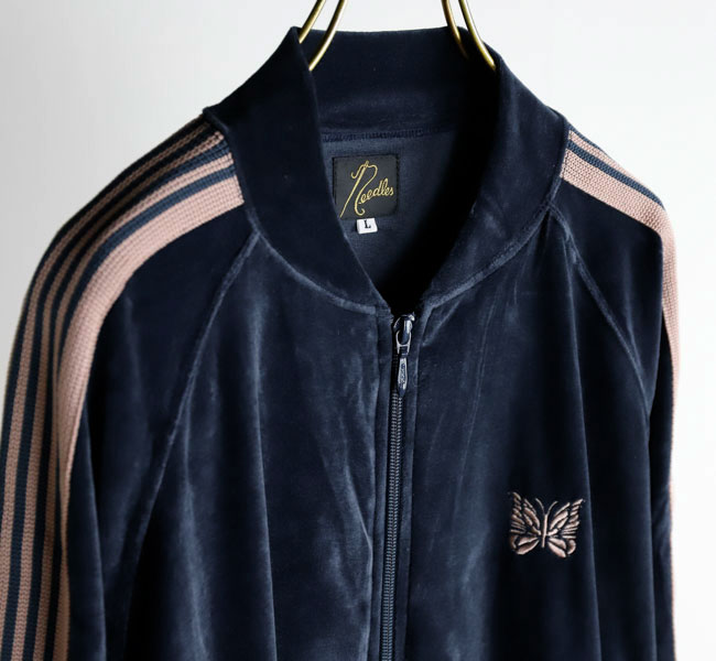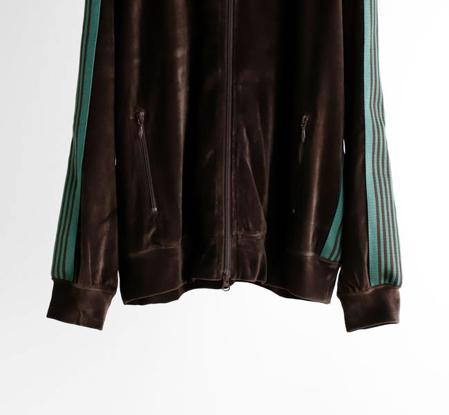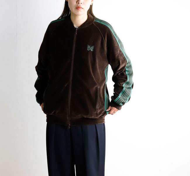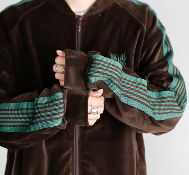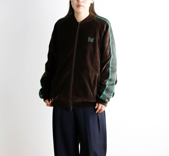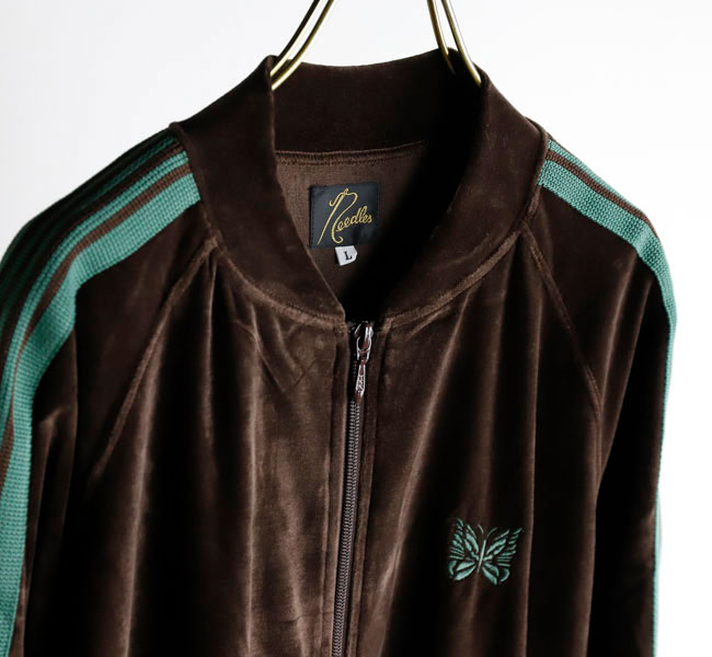 NEEDLES 26SS入荷です。定番のポリエステルジャージー素材と並んで人気の高い、ベロア素材を使用したトラックシリーズ。ソフトな発色と艶感のあるベロア特有のラグジュアリーな雰囲気が特徴的な一着です。首元はリブカラー仕様となっており、すっきりとしたスタイリッシュなイメージが強調されています。