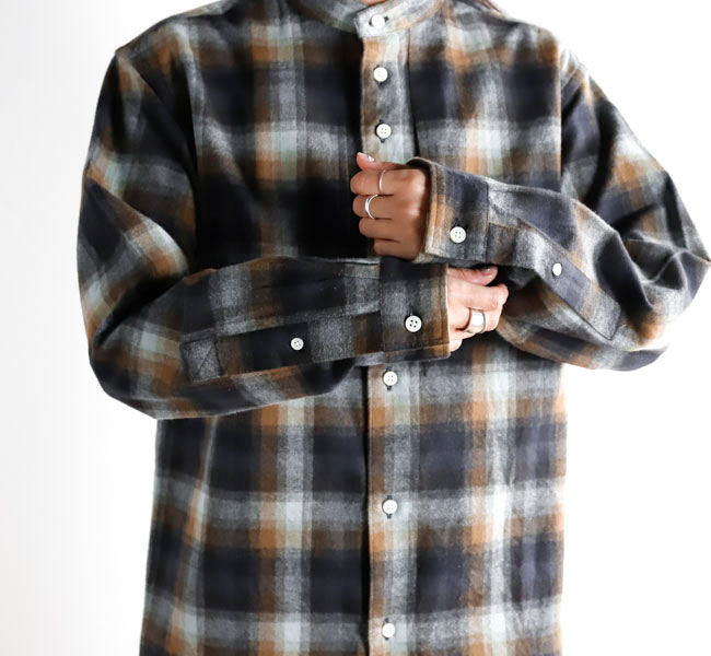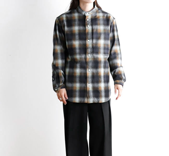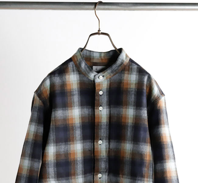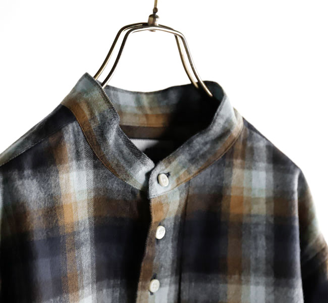 機能的な胸ポットが付いたバンドカラーシャツ。