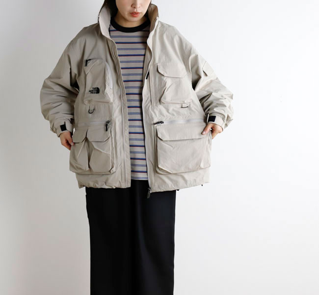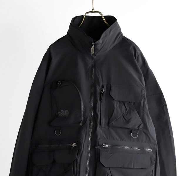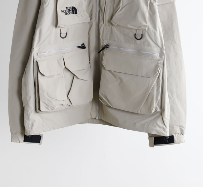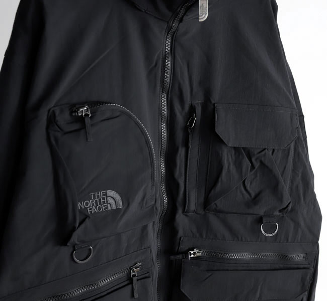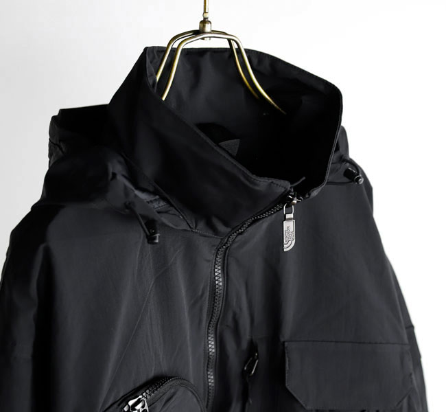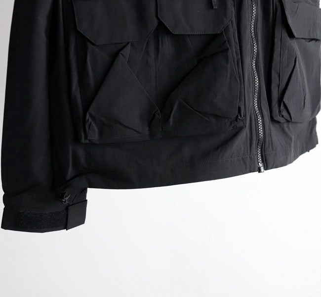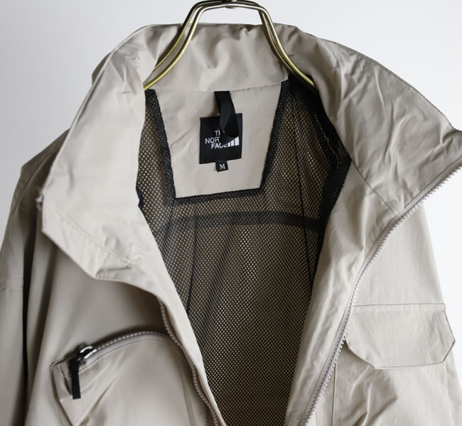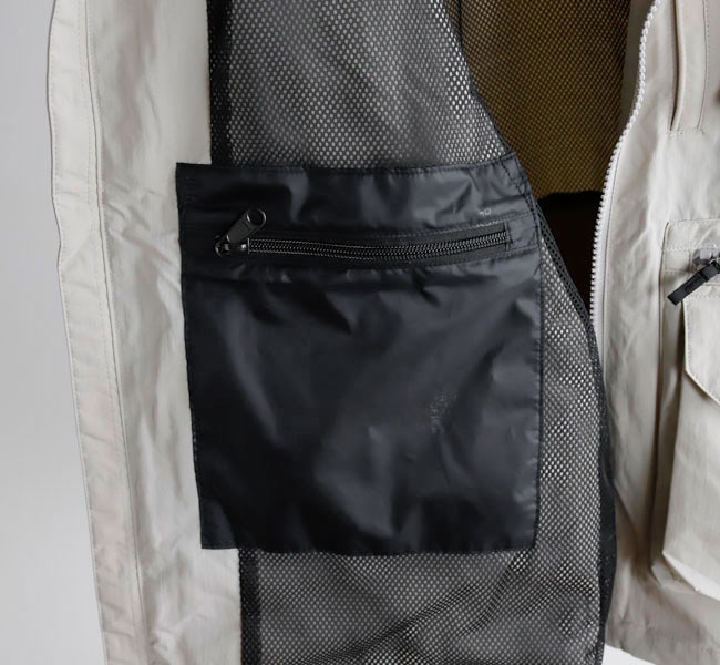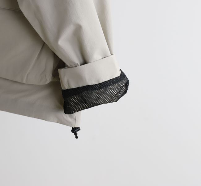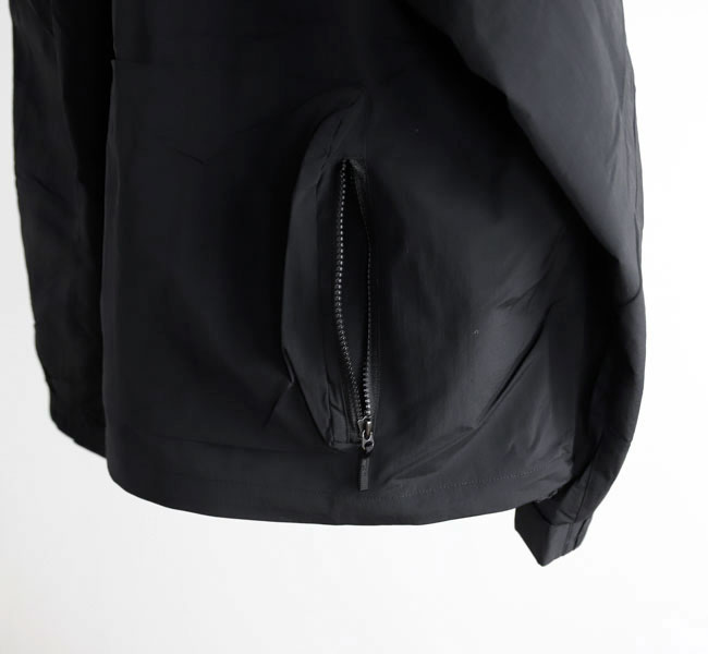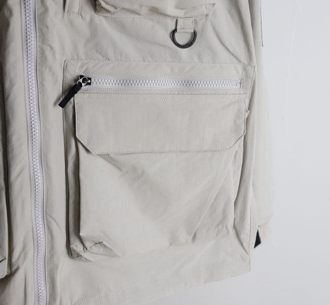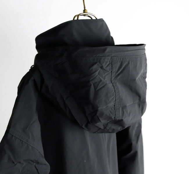 表地はコットンライクな表情のタスランナイロンを使用。フッ素化合物を含まないはっ水剤を使用したはっ水加工を施しており、多少の雨や汚れに対応します。裏地は肌離れのよいポリエステルメッシュ。大容量のマチ付きポケットは、中身が落ちにくいように面ファスナー式のフラップ付き。右胸のハーフドーム型ファスナーポケットは、貴重品の収納に便利です。背面にも大容量のマチ付きポケットを配置。襟にフードを収納できるビルトインフード仕様です。