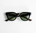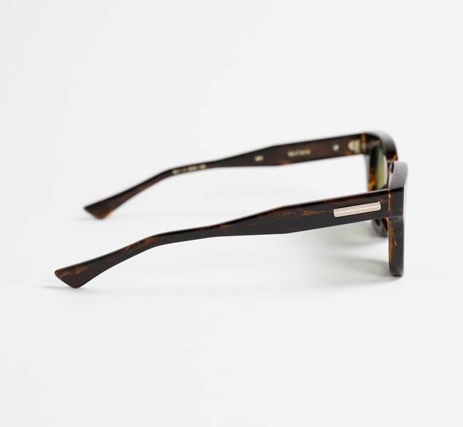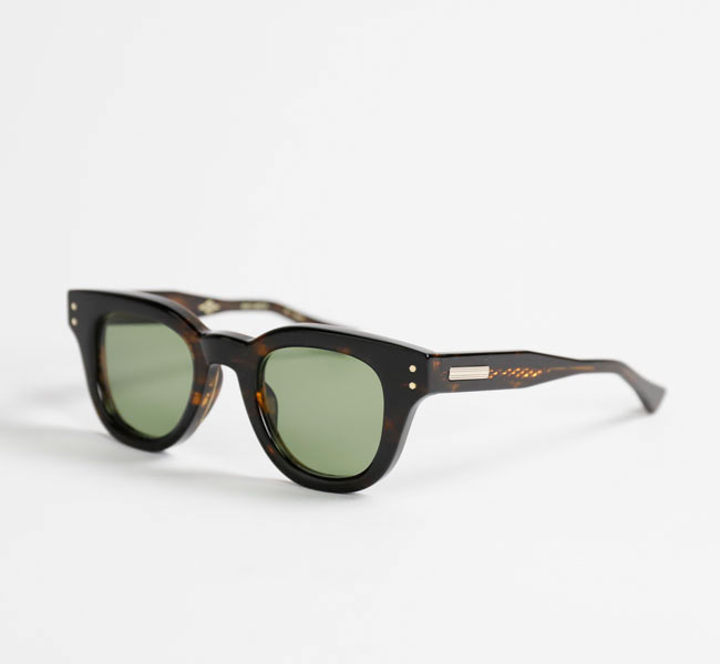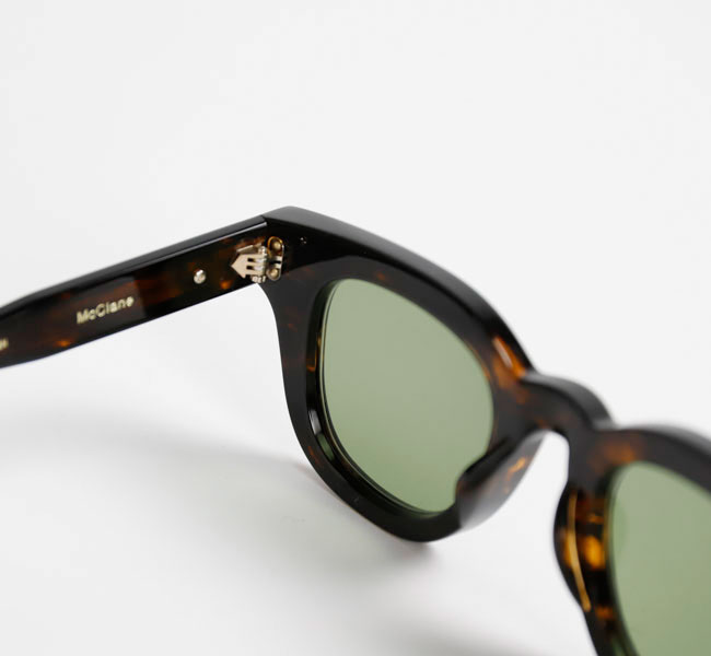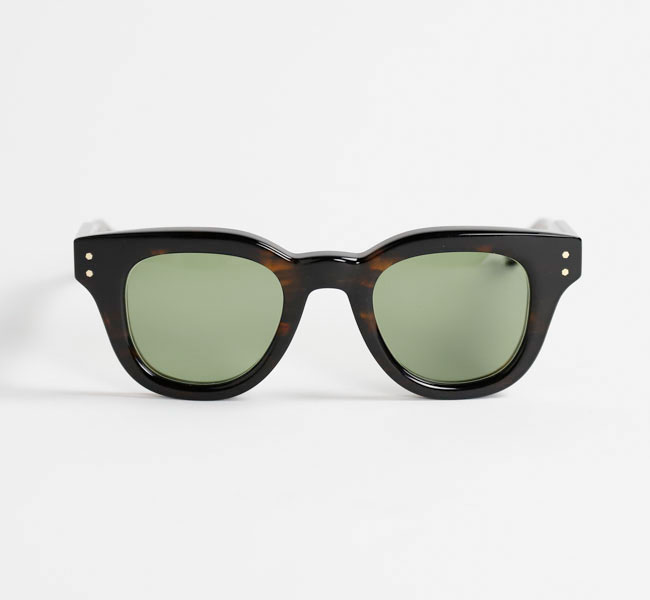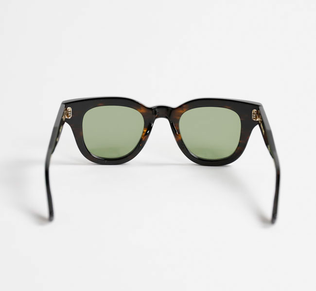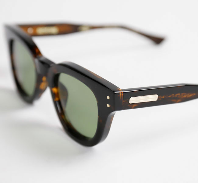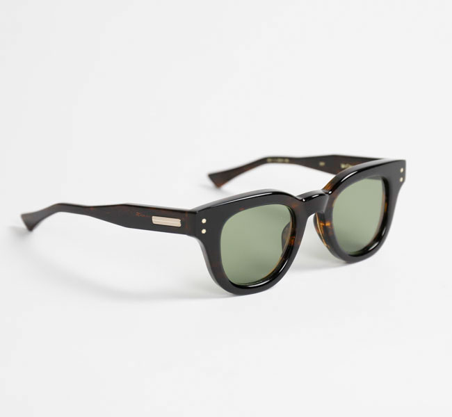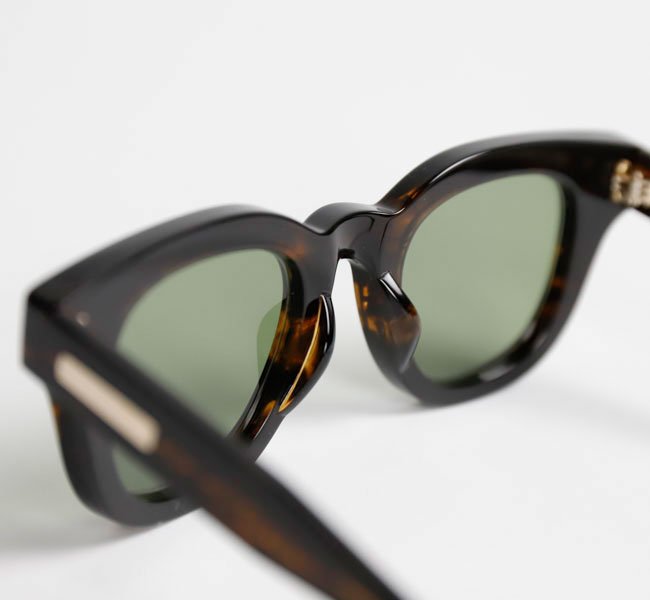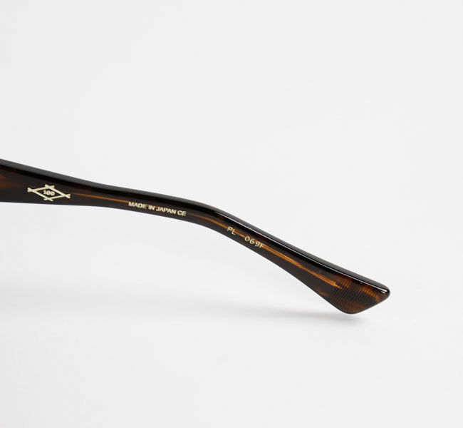 知的な印象を与える丸みのあるフレームで、少し膨らみのあるノーズブリッジもアーチ状のシンプルなデザイン。 フロントトップはノーズブリッジから丸みを帯びてコネクションまで延び、コネクション部分で切り落としたスクエアカットになっている。 見た目はシンプルなだけにアセテートの厚みが強調され肉厚な印象。