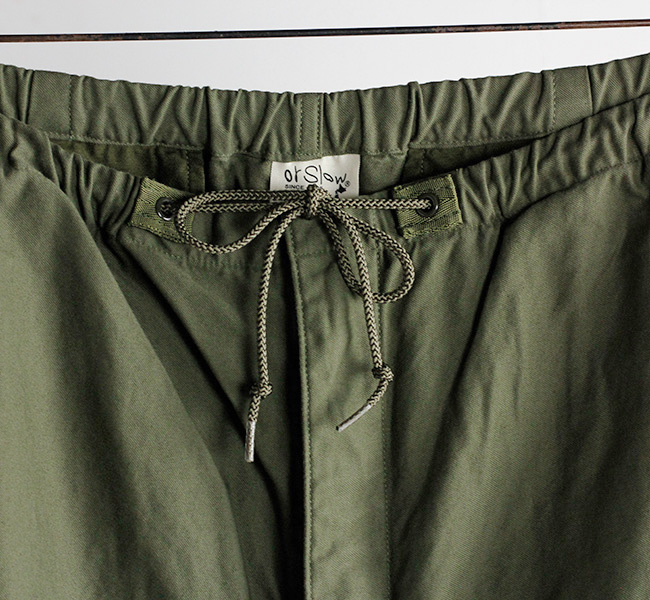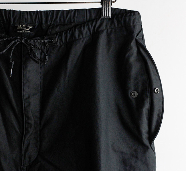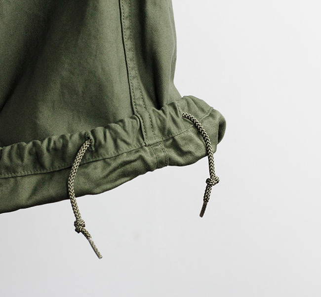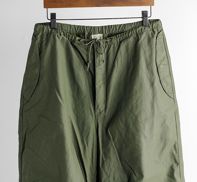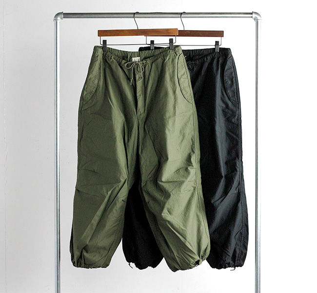 US ARMYのミリタリーパンツよりインスピレーションを受けたモデル。 ルーズなシルエットで、ウエストはサイズ調整可能なドローコード仕様で、フロント・バックポケットはフラップ付き。 膝部分にはタックが2ヶ所入っており、独特な立体感を生みます。 裾にもドローコードが付いており、絞ったり、ストレートに穿いたり、様々なシルエットに変化させることが可能です。 ブラックとアーミーグリーンの2色展開になっています。