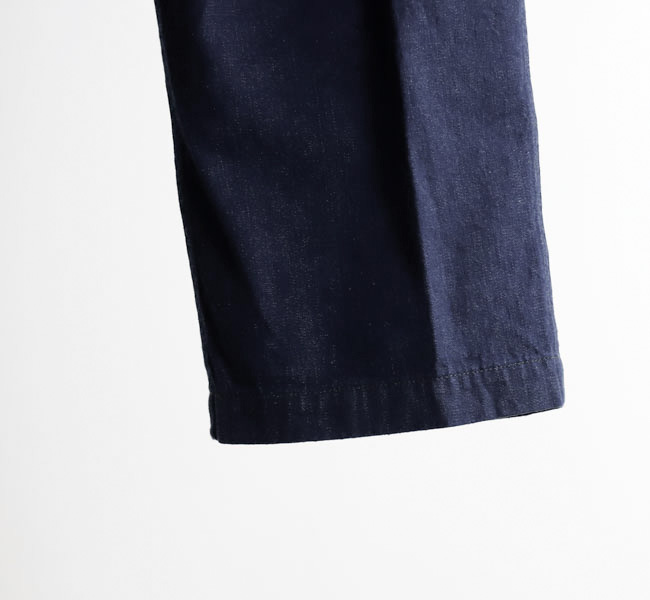 ワイドシルエットのデニムtwo tuckトラウザー。オリジナルのライトオンスデニムを使い作成しました。デニムプラスのスタイリングに5ポケットパンツとは一味違うコーディネートを楽しむことができます。